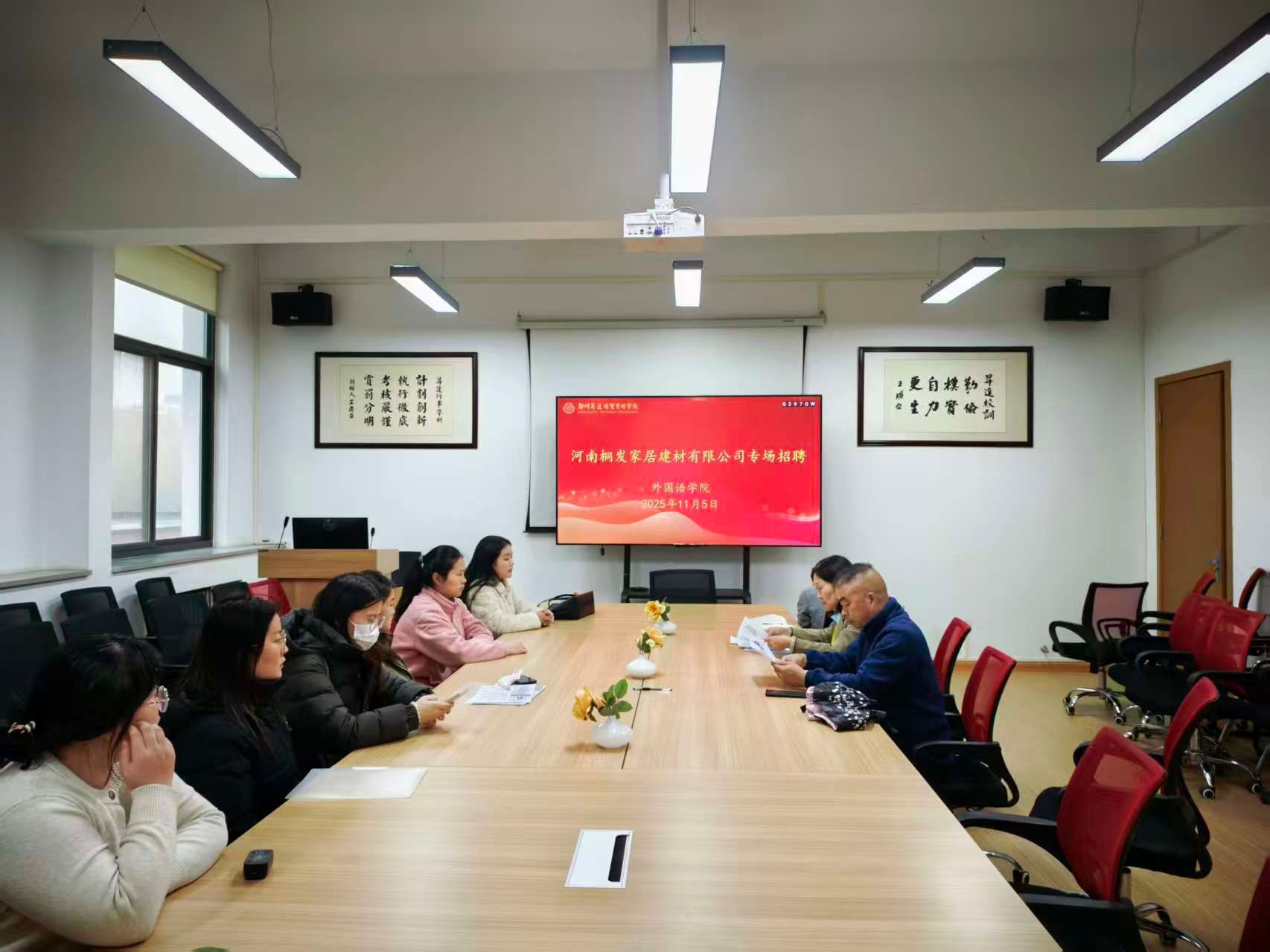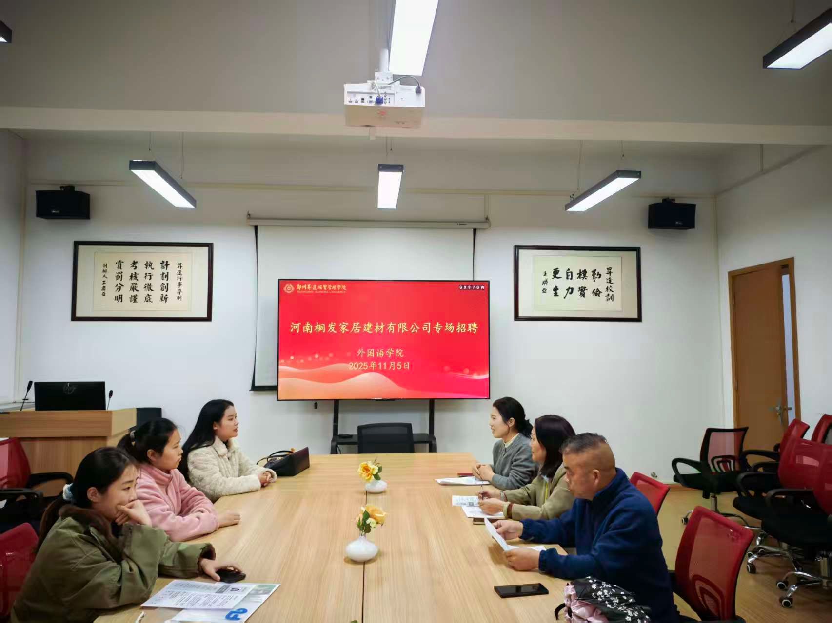 11月6日下午,外国语学院在教一楼206会议室举办河南桐发家居建材有限公司专场招聘会。本次招聘面向英语、商务英语等相关专业毕业生,聚焦家居建材外贸领域人才需求,旨在通过校企合作为学生拓展就业渠道。