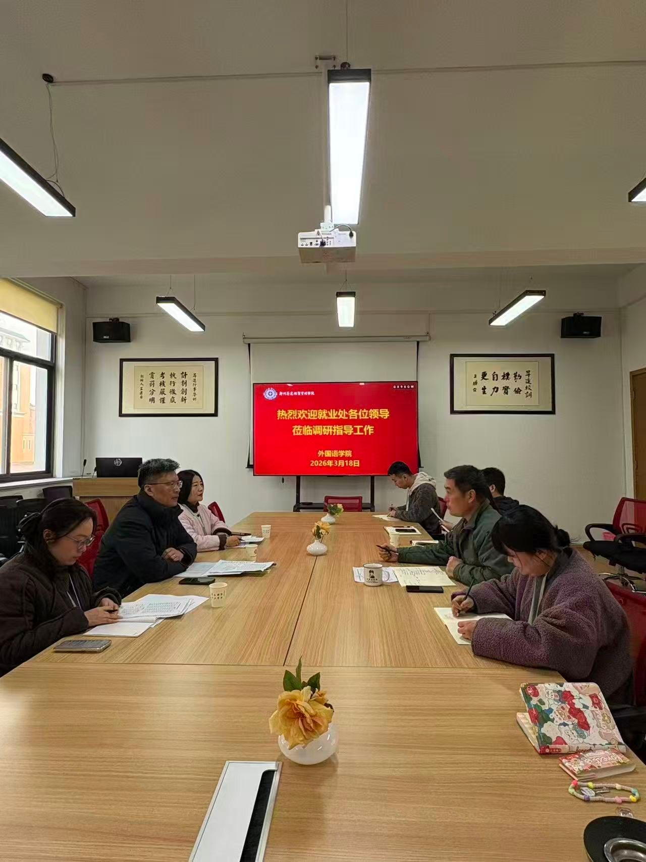 为扎实推进春季促就业攻坚行动,精准掌握2026届毕业生就业工作推进情况,破解就业工作堵点难点,3月18日上午,学校就业处冯科处长、鲁玲玉科长、许文华老师一行莅临外国语学院,开展2026届毕业生就业工作专项调研指导。调研座谈会在学院会议室举行,外国语学院党委书记石皓召、行政秘书丁玥及毕业班辅导员、就业专员参会。