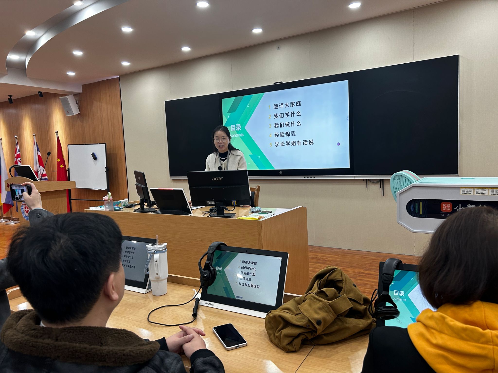 活动尾声,多位往届毕业生通过视频回顾学业生涯,分享学习方法与成长经验,并引导新生围绕语言能力提升、翻译技能实训等核心目标,制定个性化学习计划。此次入学教育为新生搭建了了解专业、规划未来的桥梁,助力其以清晰目标开启翻译学习新旅程。