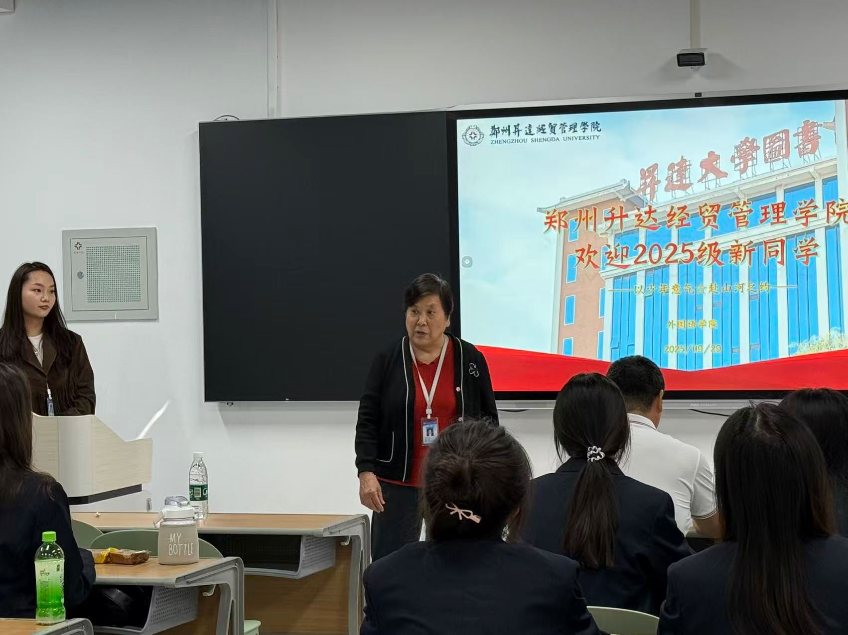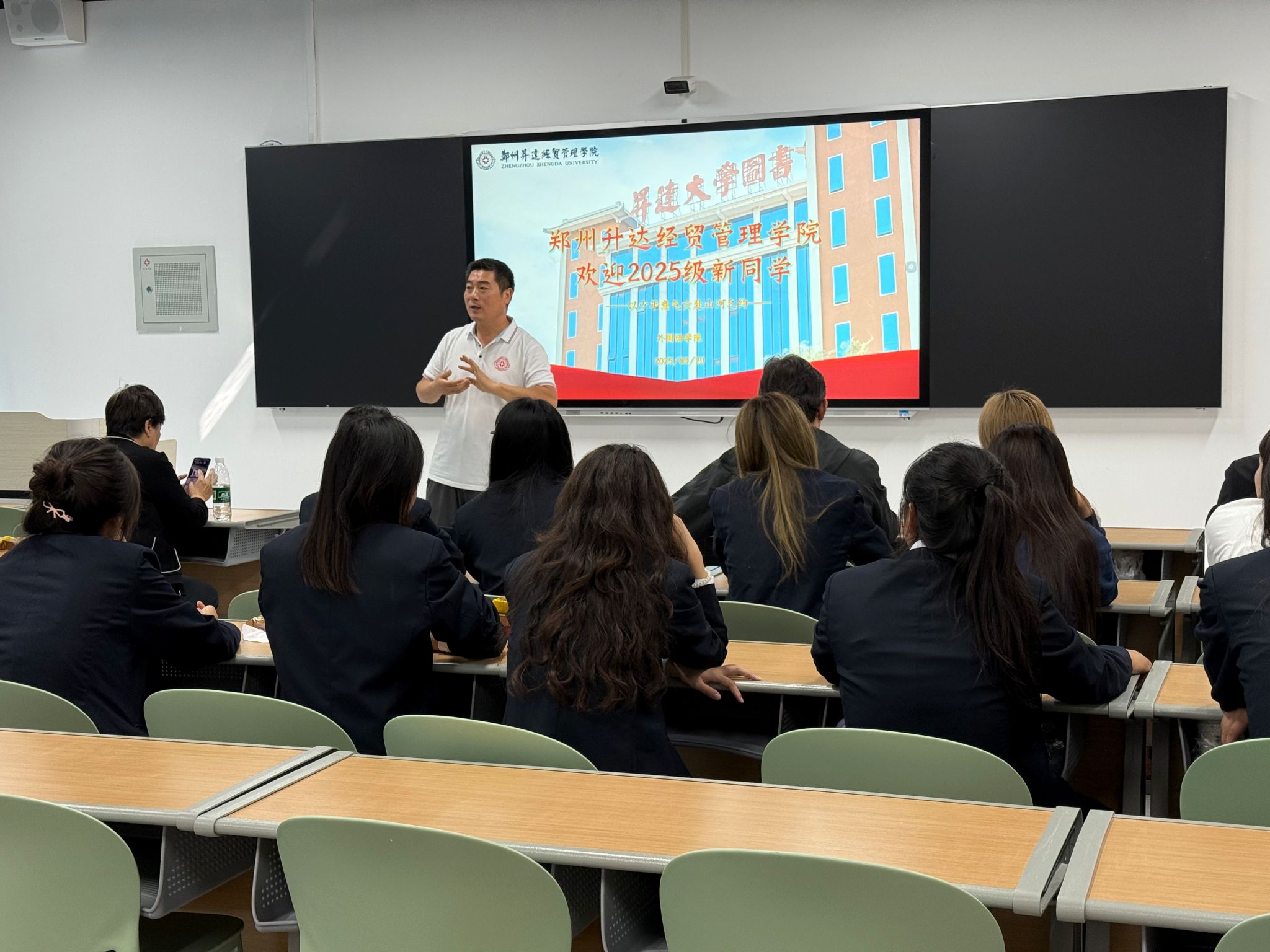 金秋送爽,丹桂飘香。9月28日上午,外国语学院2025级商务英语专业专科新生入学教育暨开学典礼于登封校区广亚大楼109教室隆重举行。外国语学院院长王莉莉教授、学院党委书记石皓召同志,携学院教学秘书祁胜利老师、商务英语专业带头人张保培老师、教研室主任张华嵩老师、教学干事杨明馨老师和辅导员祝晶晶老师,与登封校区2025级全体新生共同出席本次活动。