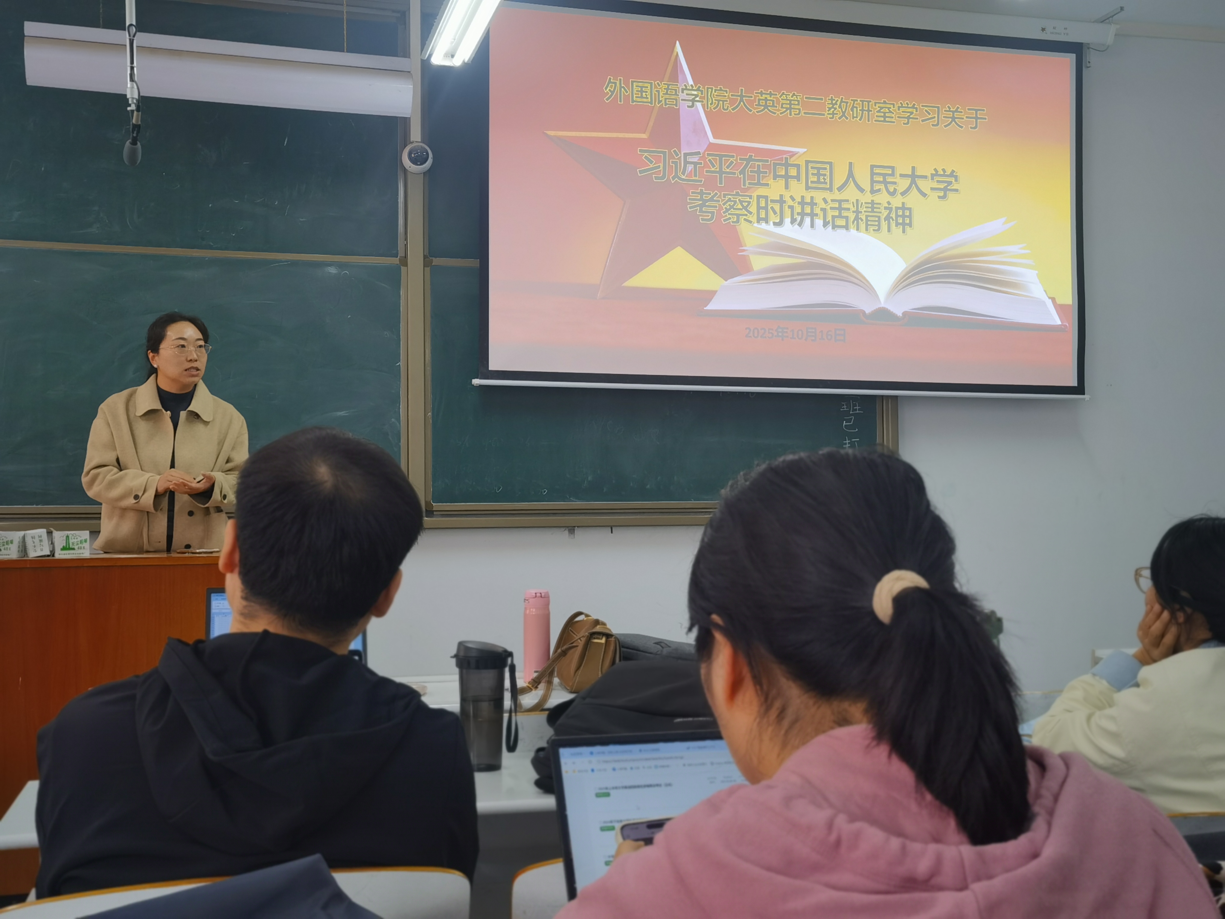 2025年10月16日下午,大学英语第二教研室组织全体教师在综合楼331教室,集中学习习近平总书记在中国人民大学考察时的重要讲话精神及《高等学校课程思政建设指导纲要》,围绕 “如何将思政元素与英语教学深度融合” 展开专题研讨,凝聚外语育人共识。学习会上,大学英语第二教研室党支部宣传委员朱明元带领教师们逐字研读两个文件要点。