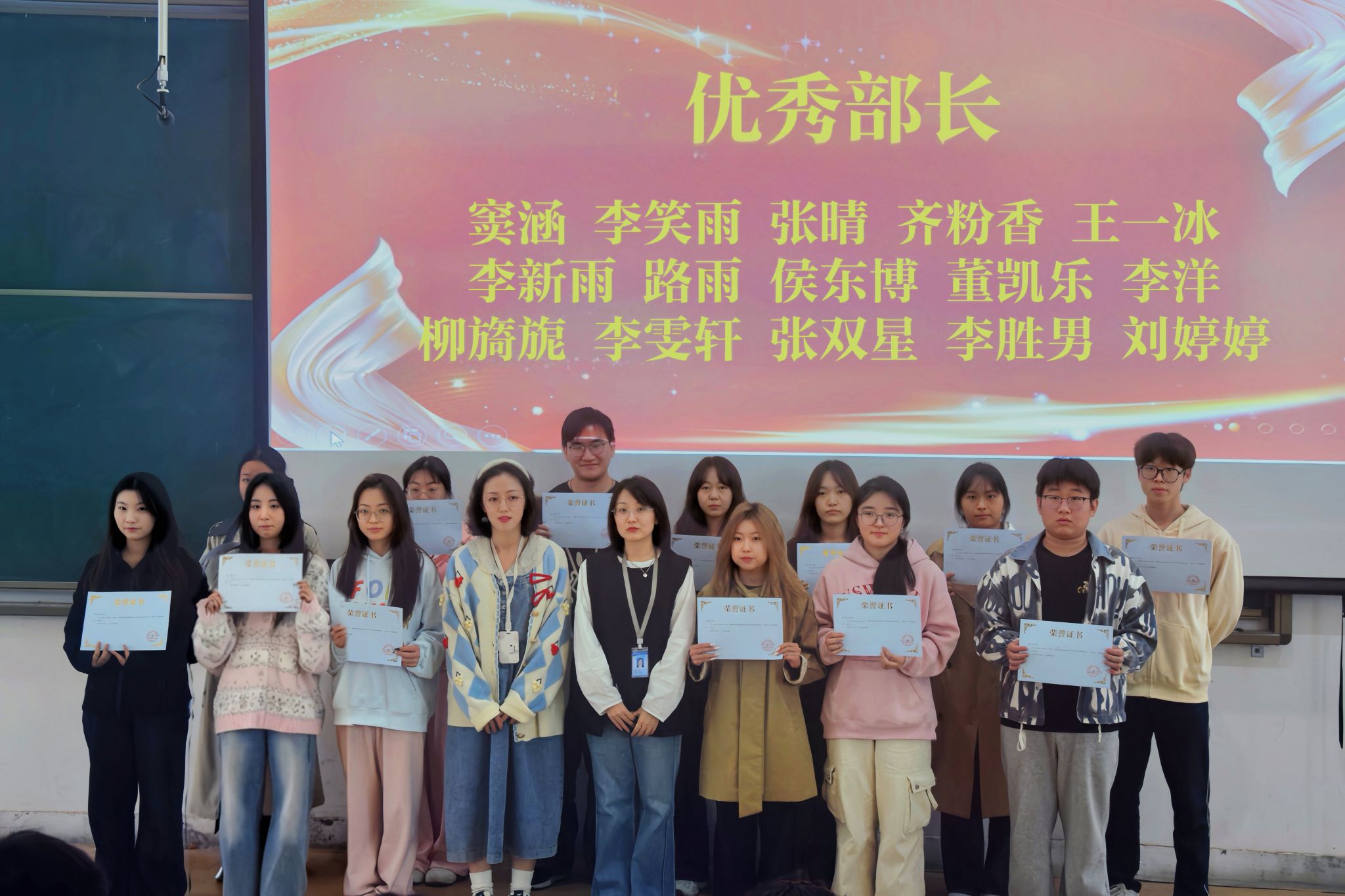 首先,由主持人荆姝畅介绍了外国语学院团学组织,展现了学院团学组织积极昂扬的风采风貌。随后对第二十九届团学工作中的优秀个人进行表彰,由行政秘书兼团委书记丁玥老师和团委副书记武珍毅老师依次为获得“优秀部长”、“优秀志愿者”的同学们颁发荣誉证书并合影留念。