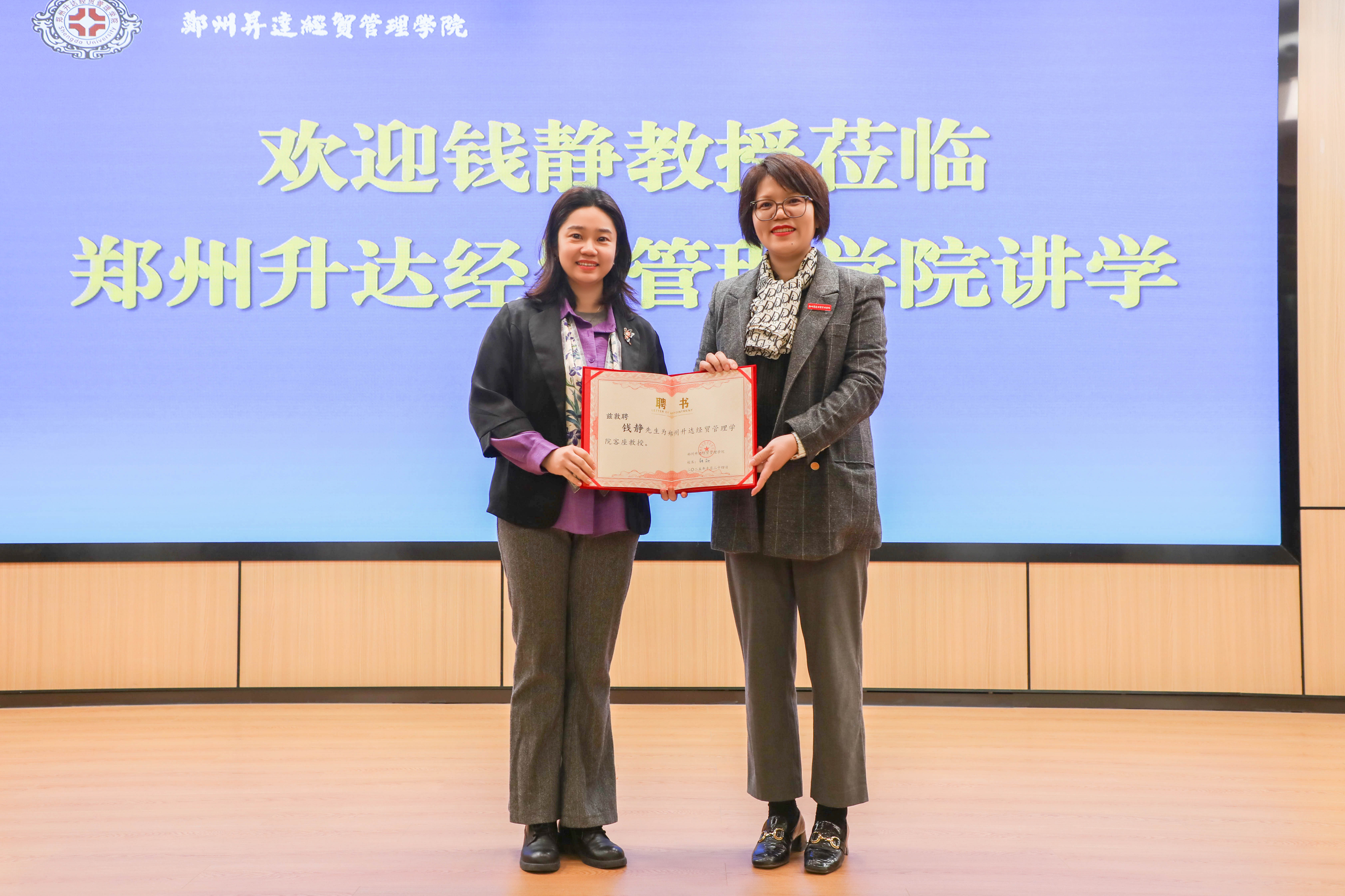 在讲座开始前,校长张欣教授为钱静教授颁发客座教授聘书,对其莅校指导讲学表示热烈欢迎,并希望今后她能有更多的时间来升达指导交流工作。