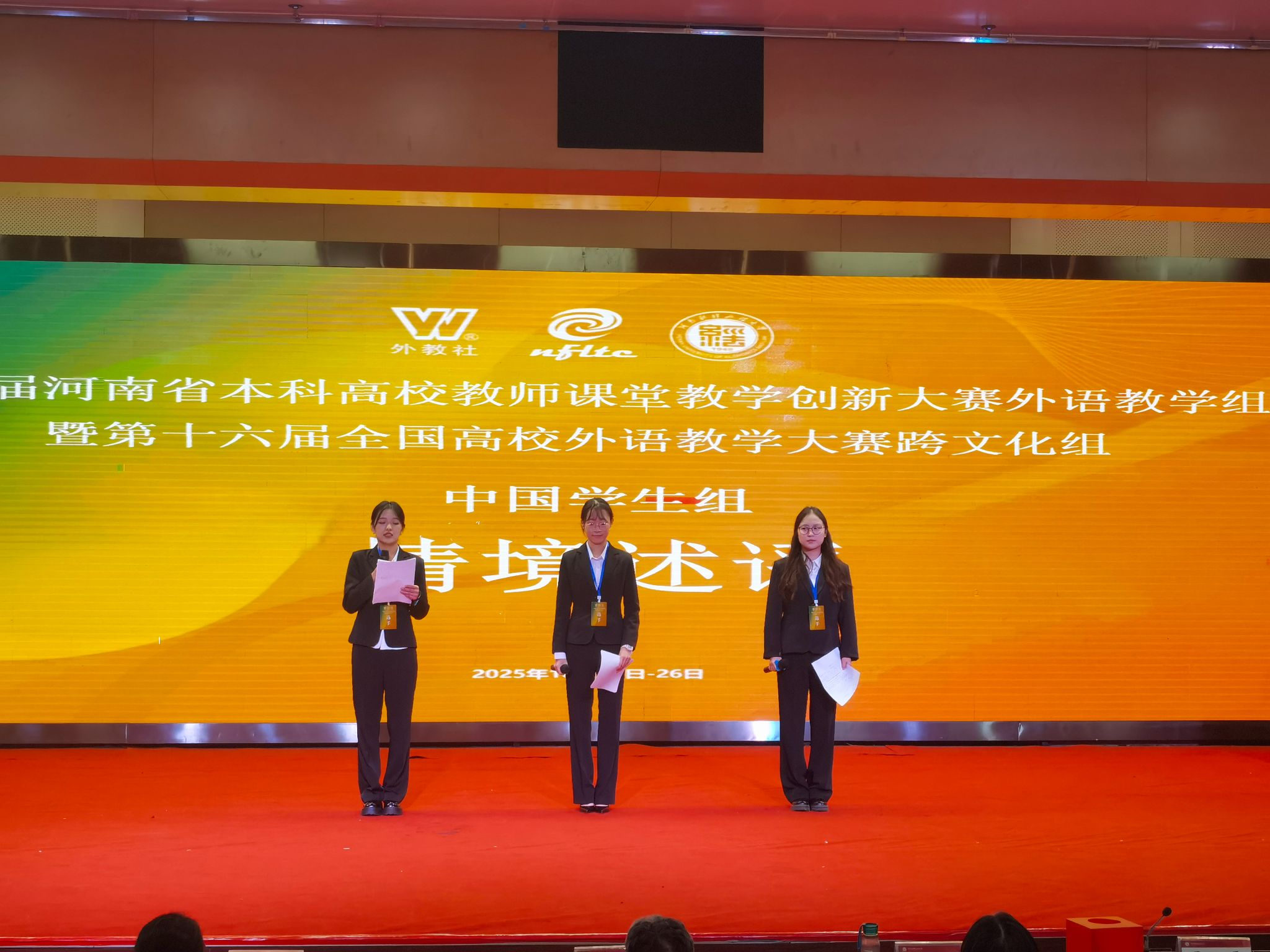 2025年10月25—26日,在外国语学院刘露、王宇两位老师的带领下,由23级英语本科一班陈苗苗、24级法学本科二班王娅帆、24级汉语言文学本科四班丁亚茹三名同学组成的代表队一路过关斩将,获得“外教社杯”全国高校学生跨文化能力大赛河南赛区一等奖。25日,我队以“中非矿业企业共建项目文化冲突”为例,给出切合实际的解决方案,团队成员分工协作、精彩演绎,在复赛中给评委留下极其深刻的印象,挺进决赛。在26日进行的“知识问答”“情景评述”和“中国文化故事”三项比赛中,对选手的国内外百科知识、临场情景组织和分析能力、语言组织和表达能力等的要求非常高,但我校代表队的三位选手依然沉着应对,最终在近40支队伍中脱颖而出,荣获一等奖,赢得了评委的一致高度评价。