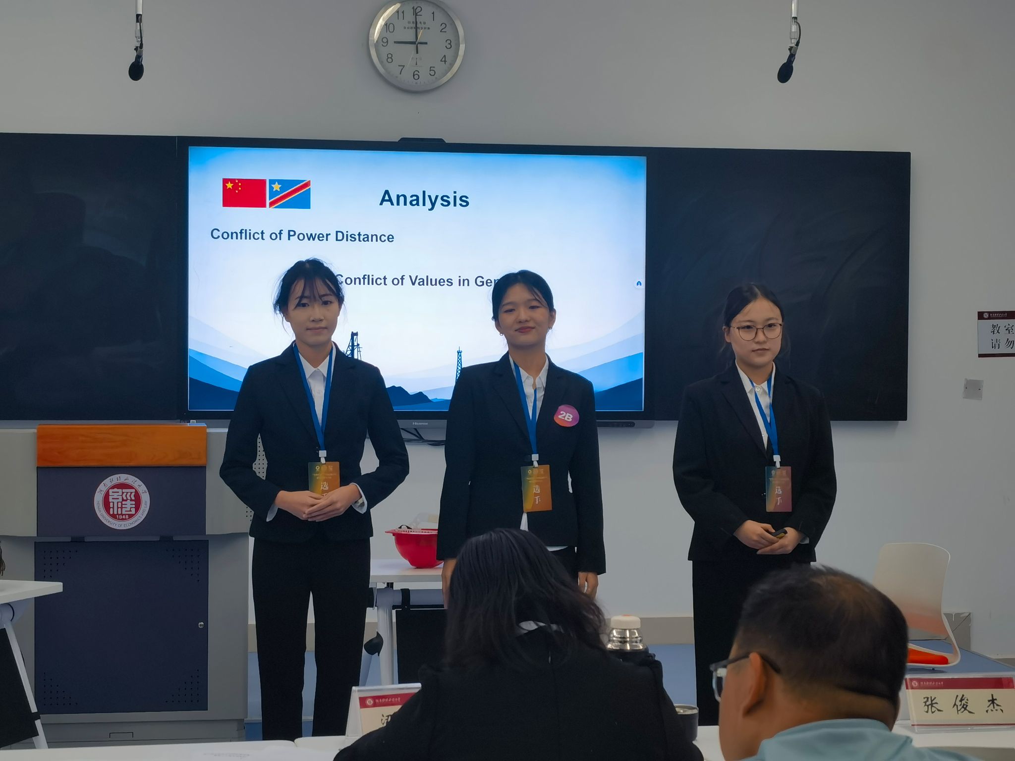 他们的参赛案例深度聚焦中国矿业集团在非洲的运营实践,生动讲述了中国企业在“走出去”过程中,如何通过有效的跨文化交流,实现与当地社区、员工和文化的共生共赢。在展示中,陈苗苗同学凭借其出色的语言能力确保了沟通的流畅;王娅帆同学对问题的精彩剖析与诠释展现了专业的素养;丁亚茹同学则凭借强大的知识储备与对问题的理解分析,在知识问答项目上取得优异的成绩。三位同学配合无间,将所学专业知识完美融合,对案例进行了富有层次和深度的阐释,以其创新的视角和解决复杂文化冲突的务实方案,给评委留下了深刻印象。