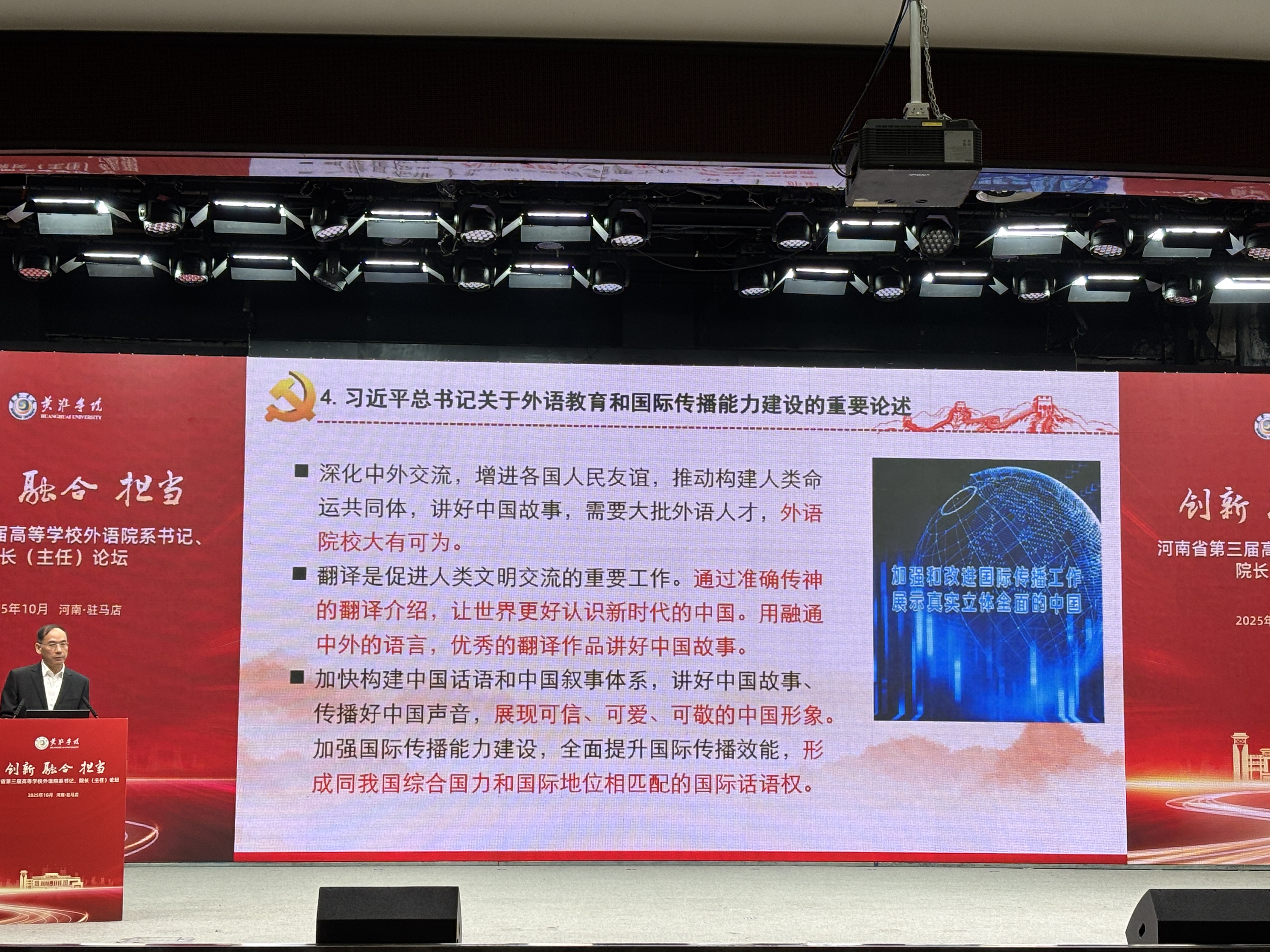 2025年10月24日至26日,河南省第三届高等学校外语院系书记、院长(主任)论坛在黄淮学院举行。本届论坛以“创新·融合·担当”为主题,汇聚全国外语教育界专家学者,共同探讨数智赋能外语教学改革、学科交叉融合与新时代外语人才的使命担当。外国语学院院长王莉莉教授、党委书记石皓召、副院长贺光辉副教授和骨干教师张保培应邀出席。