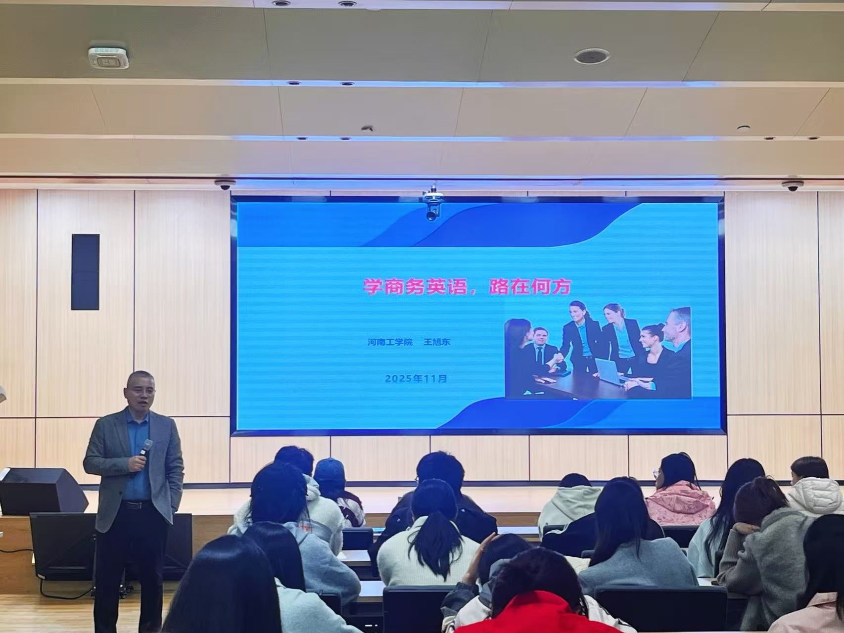 11月4日16:30,河南工学院外国语学院王旭东副院长应邀莅临我校外国语学院,在图书馆第一报告厅为我校商务英语专业师生举行了题为“学商务英语 路在何方”的主题讲座。