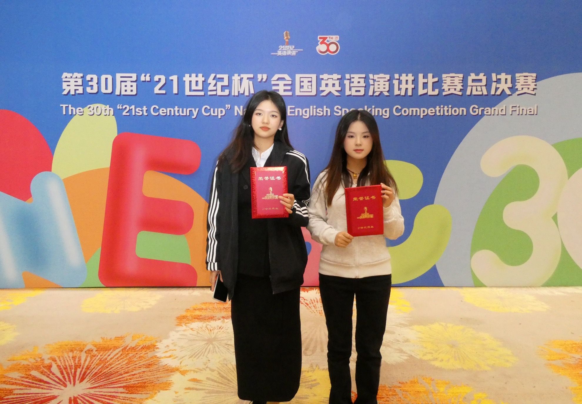 2025年11月13日至17日,第30届“21世纪杯”全国英语演讲比赛总决赛在浙江杭州太虚湖假日酒店成功举办。在外国语学院领导的鼓励支持下,我校外国语学院22级商务英语专业1班张淼和23级英语专业1班陈苗苗从校赛选拔、河南省决赛等多轮比拼中脱颖而出并成功斩获全国三等奖,可喜可贺。