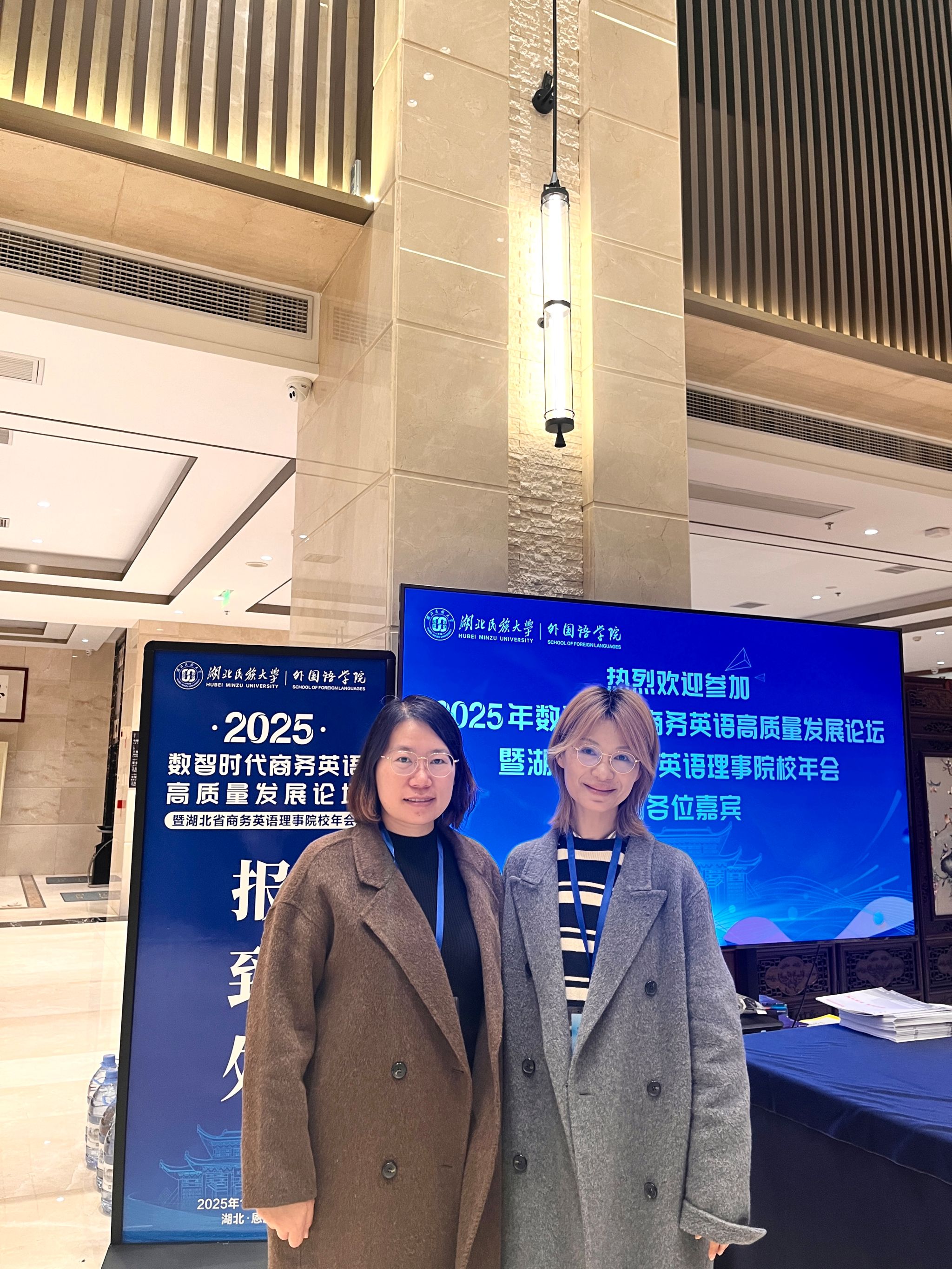 11月7日至9日,2025年数智时代商务英语高质量发展论坛在湖北民族大学召开。本次盛会由中国对外贸易经济合作企业协会国际商务与语言服务工作委员会、湖北省国际商务与语言服务专家指导委员会主办、湖北民族大学外国语学院承办。我校商务英语专业教研室主任张华嵩和学院教学督导王婷婷两位老师参加了论坛活动,与来自全国的数十所高校的外国语学院院长、商务英语专业负责人及企业代表120余人齐聚一堂,以“数智时代商务英语高质量发展”为核心,共商专业建设、人才培养与学科转型大计。