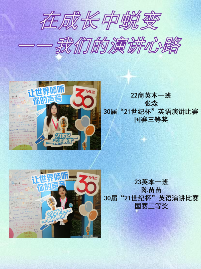 为激发学生英语学习热情,提升演讲综合素养,助力学生在高水平赛事中锻炼自我,2025年11月21日,外国语学院英语演讲社在校内实训B楼504教室举办了“在成长中蜕变——我们的演讲之路”经验分享会。本次活动特邀在第30届中国日报社“21世纪杯”全国英语演讲比赛中取得优异成绩的同学——22级商务英语本科一班张淼,23级英语本科一班陈苗苗,面向社员分享参赛心得与演讲技巧。