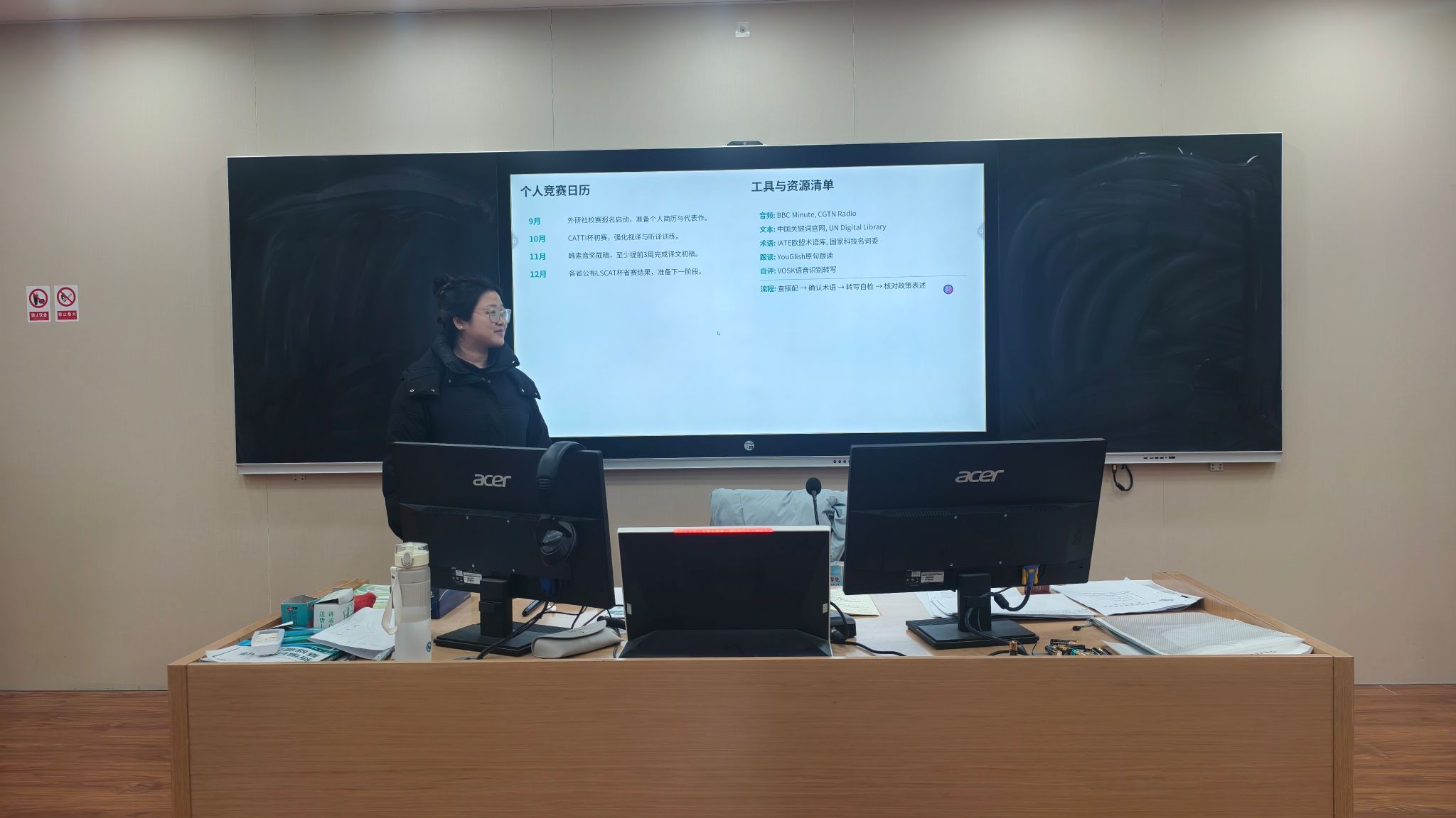 社团指导教师孙燕冉首先结合自身丰富的口译教学与赛事指导经验,系统梳理了国内外主流口译赛事的类型、参赛要求及备赛技巧。从海峡两岸口译大赛、“外研社·国才杯”口译赛项到各类区域性口译赛事,老师逐一分析了不同赛事的特点与价值,强调“每一次赛事参与都是一次宝贵的成长契机,也能为自己的简历上添一道彩”。孙老师的分享为同学们指明了参赛方向,进一步激发了大家的竞技热情与学习动力。