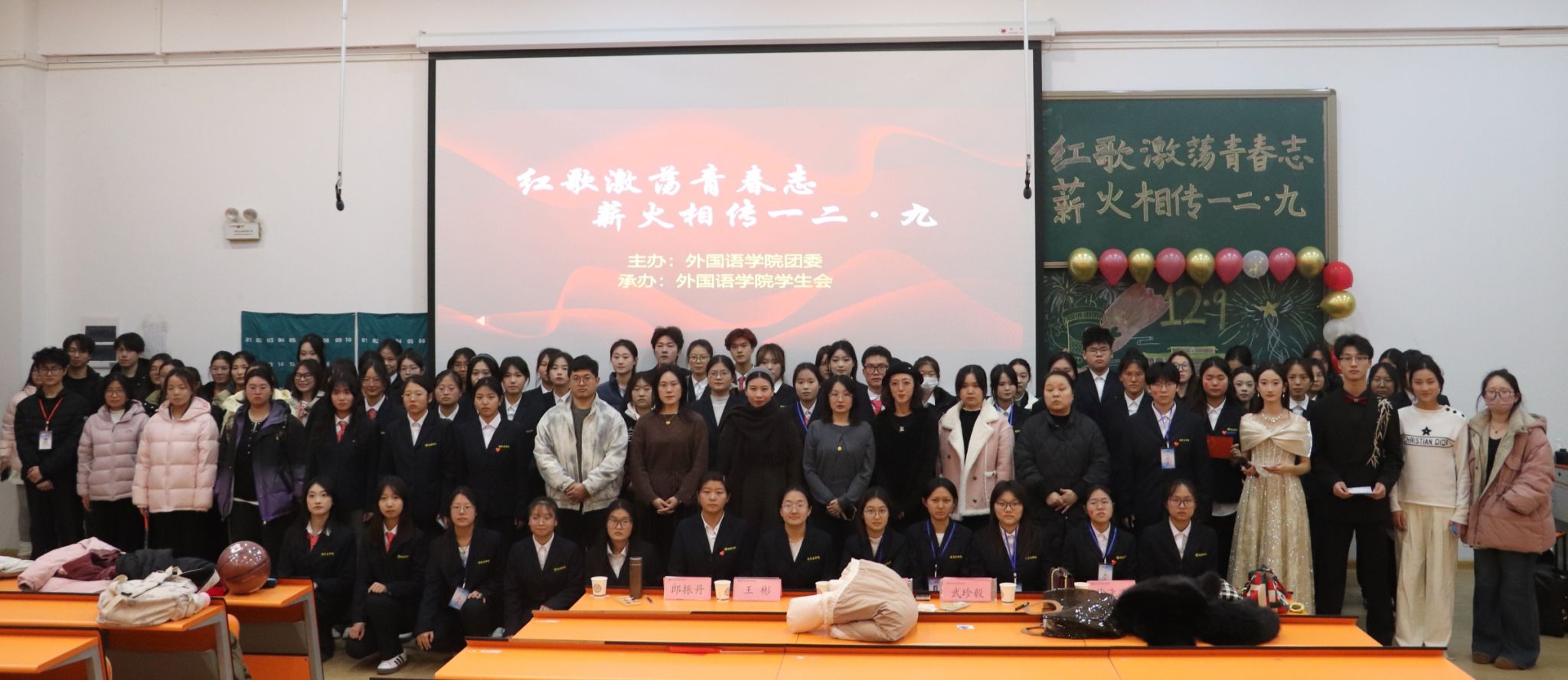 为重温革命历史、传承红色基因,引导广大青年学子厚植家国情怀、勇担时代使命,由外国语学院团委学生会主办,外国语学院组织部、星光公社承办的以“颂歌忆峥嵘,青春续华章”为主题的一二·九红歌合唱比赛于2025年12月9日晚18:30在教学二号楼116正式展开。出席本次活动的有外国语学院党委副书记兼团委书记丁玥老师,外国语学院党建组织员王彬老师,院团委副书记武珍毅老师,徐飞飞老师,郎振丹老师及指导老师张媛媛老师、岳晓宁老师及外国语学院各年级学生代表。
