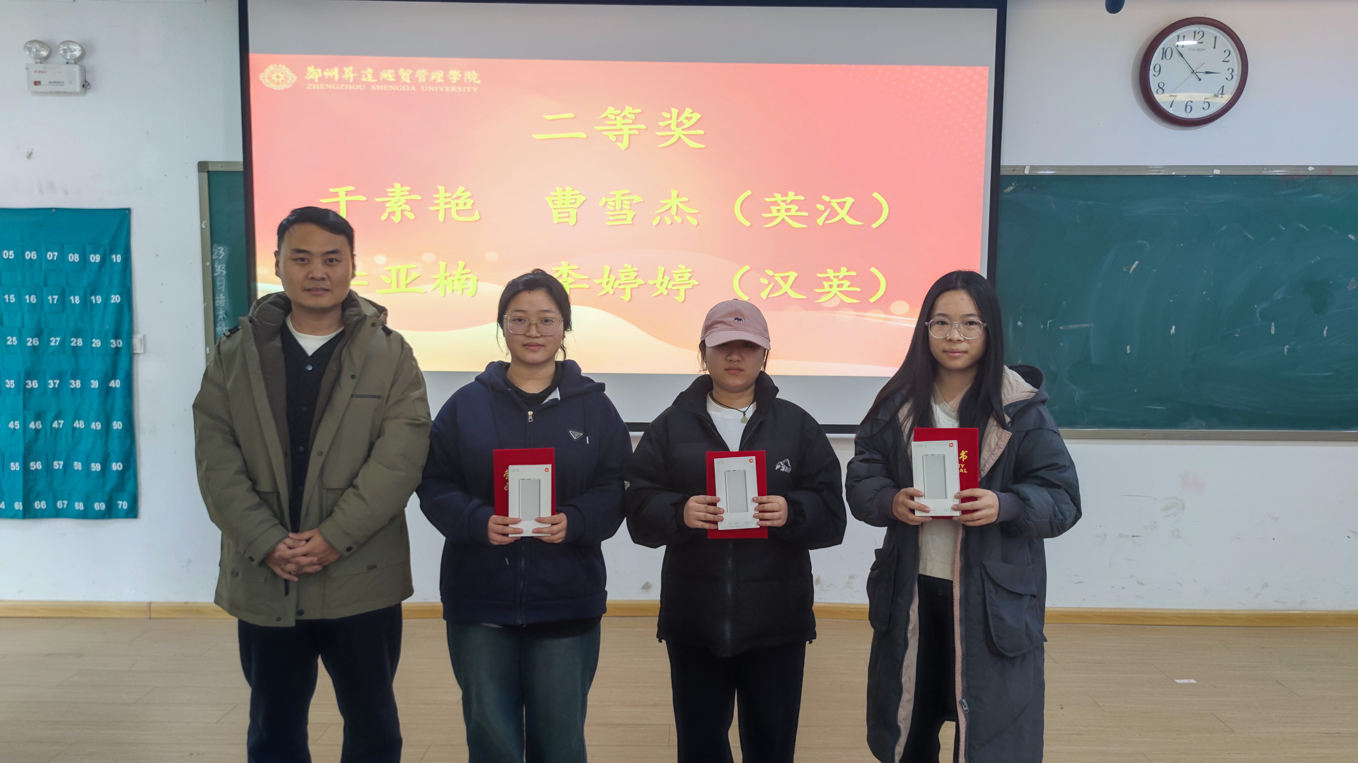 2025年12月10日中午,颁奖仪式在教学一号楼109圆满举行,翻译教研室主任孙燕冉、闫冰老师、袁航老师、王余成老师出席了该活动。本次翻译大赛中,朱琳琳等同学获得一等奖;李亚楠、曹雪杰等同学获得二等奖;杨育晴、邵星茹等同学获得三等奖。