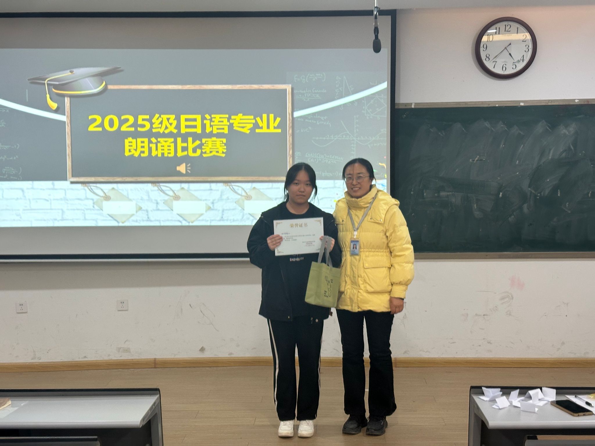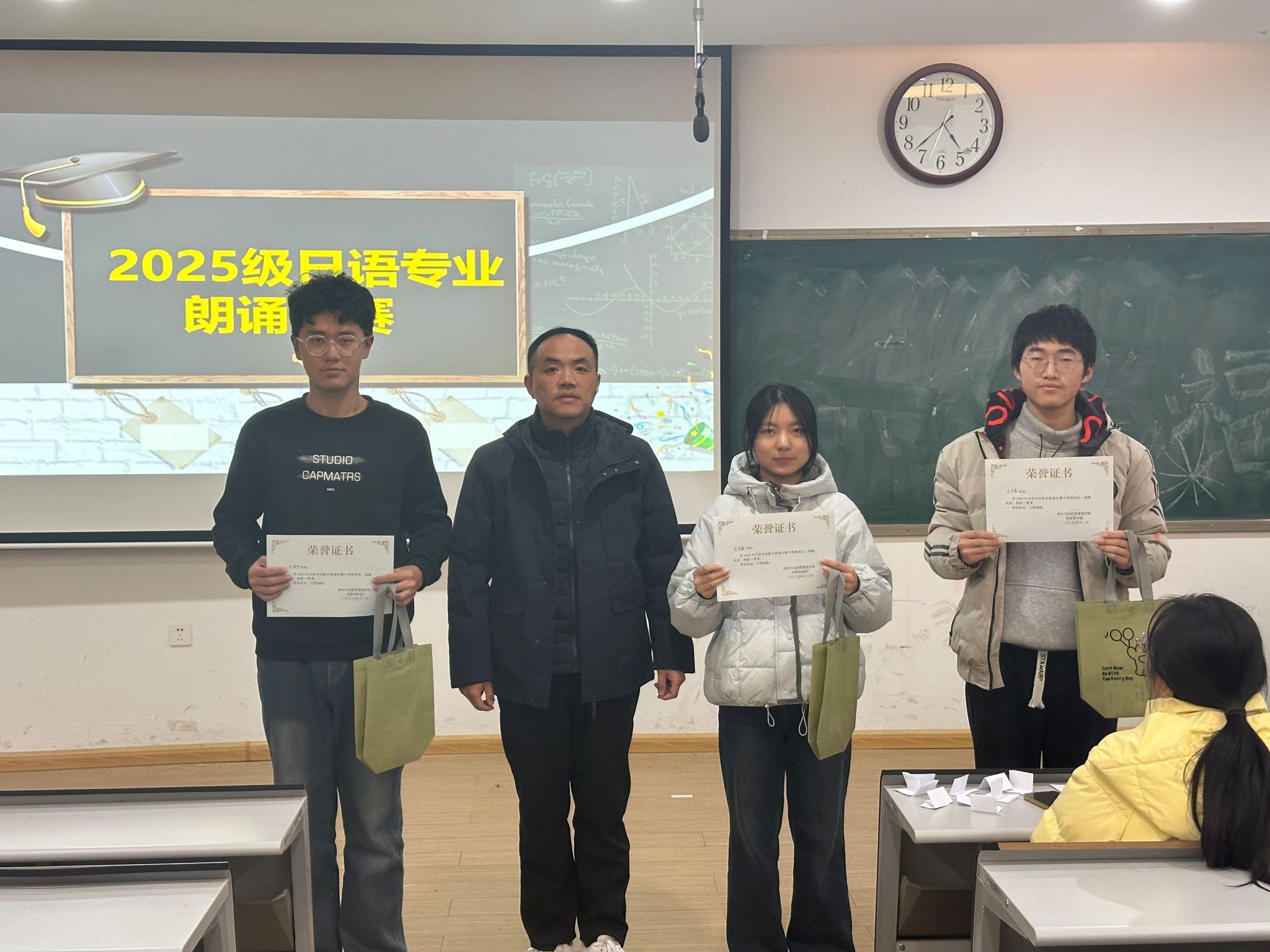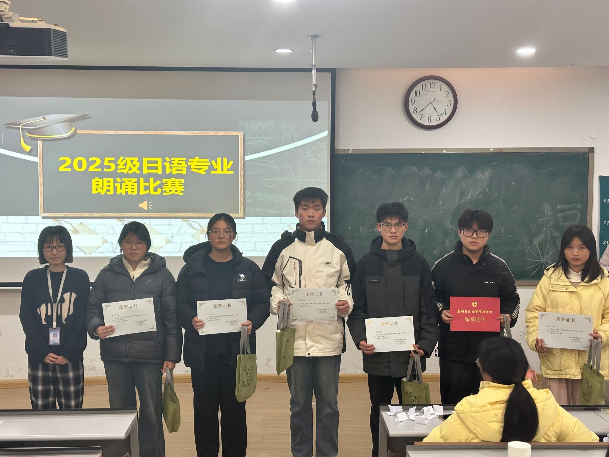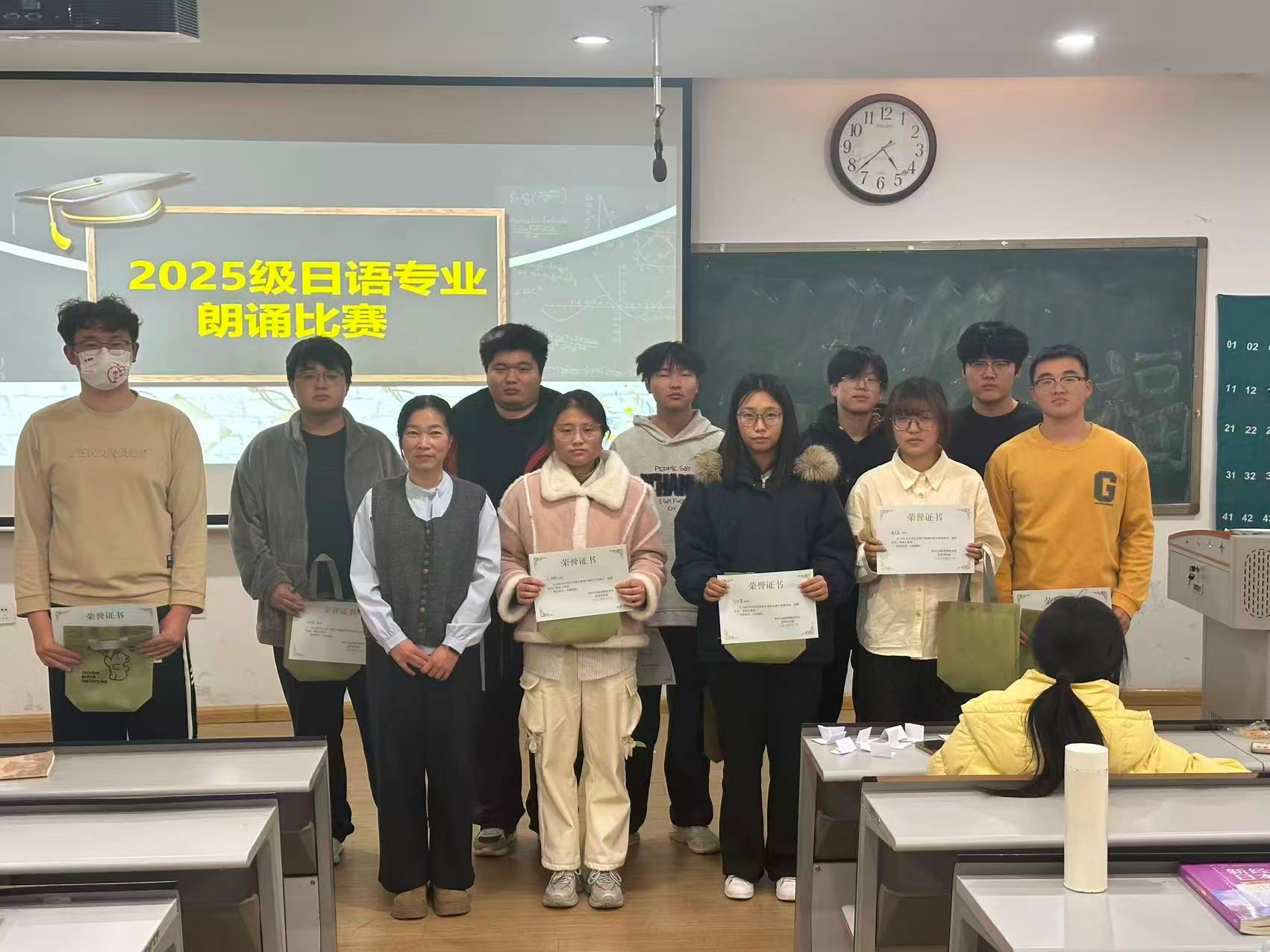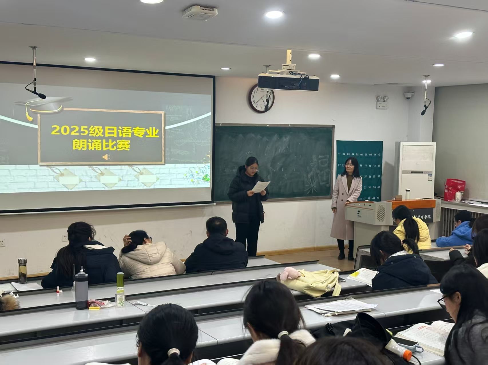 2025年12月22日13:30,日语专业2025级新生朗诵比赛在教学一号楼109教室圆满落幕。本次比赛由日语教研室精心策划举办,旨在搭建日语语言实践平台,激发新生学习热情,展现专业学子风采,为校园文化注入多元活力。