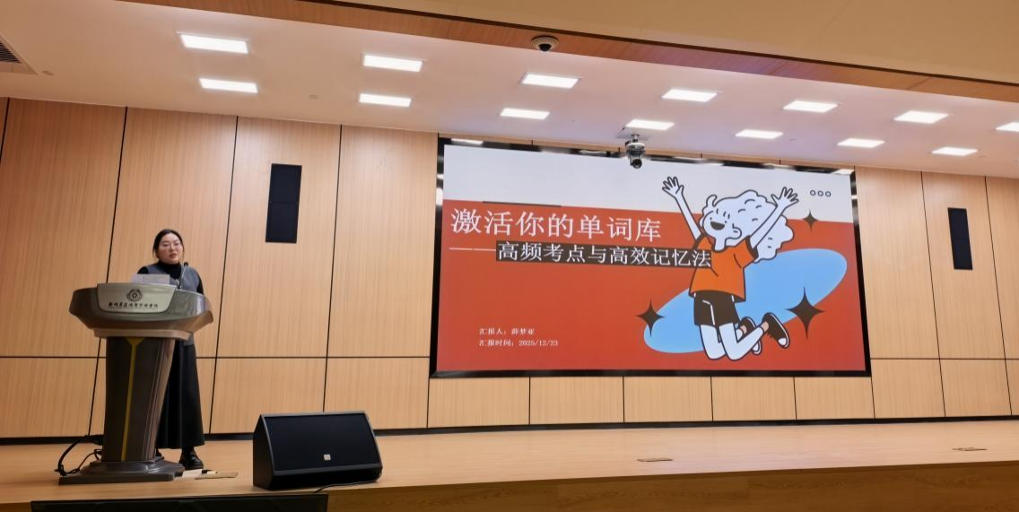 为帮助同学们跳出低效记忆的循环,掌握科学备考的钥匙,外国语学院大学英语第一教研室薛梦亚老师以“激活你的单词库——高频考点与高效记忆法”为主题,开展了四级词汇专项讲座,本次讲座于2025年12月23日晚18:30在新图书馆二楼1号报告厅举行,外国语学院薛梦亚老师主讲,旨在引领同学们从全新视角审视词汇学习,实现备考效率的实质性飞跃。