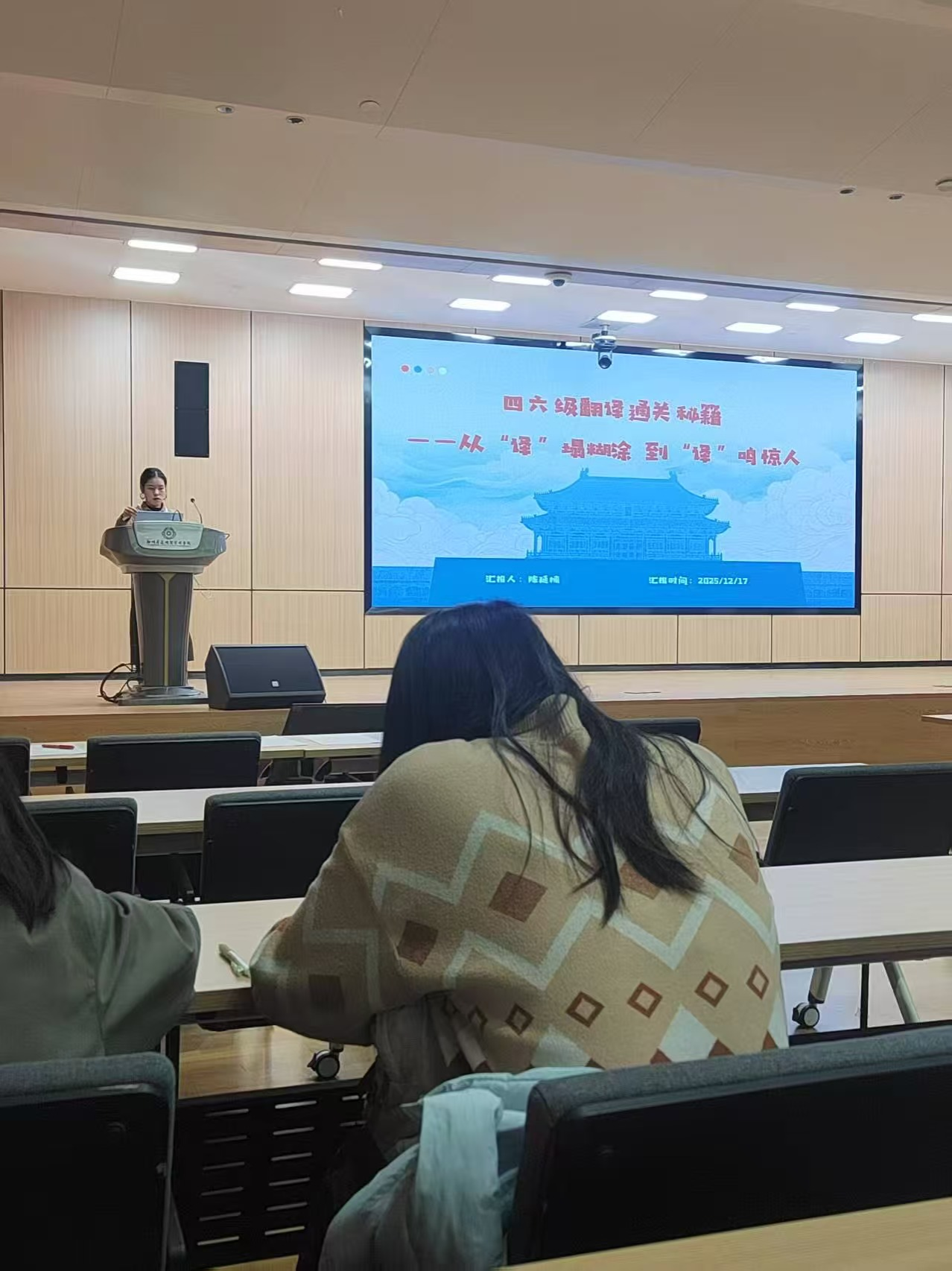 2025年12月17日晚,由外国语学院大英第一教研室陈延楠老师主讲的《四六级翻译通关秘籍》主题讲座在我校新图书馆二楼1号厅成功举办。本次讲座中,她以“从‘译’塌糊涂到‘译’鸣惊人”为主题,系统性地分享了其独创的“拆解—重构—应用”翻译提升路径。