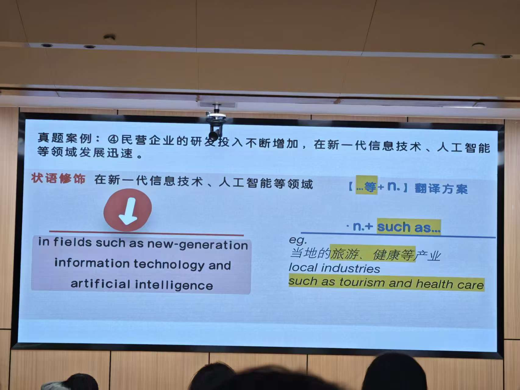 讲座内容围绕五大模块展开:从翻译认知重塑入手,剖析四六级评分标准(内容、语言、结构三维矩阵),重点讲解了可操作性极强的“句子拆解三步法”(定谓语、找主语、添修饰),并提供了选词技巧与五大高频句式模板。陈老师以2025年12月四级真题《中国政府与民营经济》为贯穿案例,带领学生现场演练,将方法论转化为实战能力。她强调,翻译的本质是基于规则的信息转换,考生应成为冷静的“解码者”与精准的“得分手”,并需坚决规避时态、主谓一致、冠词等“硬伤”。