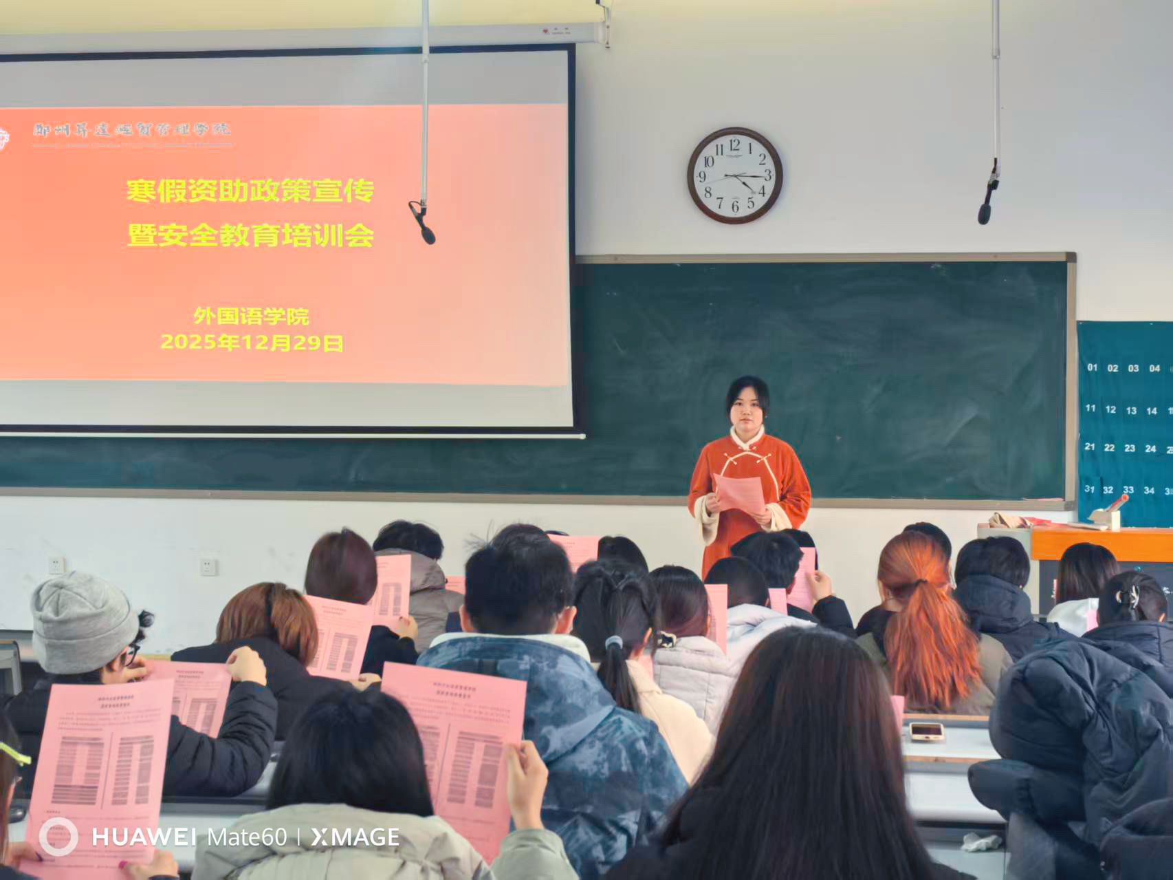 为扎实做好寒假期间学生资助政策宣传工作,提升资助宣传志愿者与宣传大使的业务能力与安全意识,2025年12月29日下午,外国语学院于教一楼208大教室组织召开了专题培训会议。会议由学院资助专员徐飞飞老师主持,全体资助宣传志愿者及学生宣传大使参加。