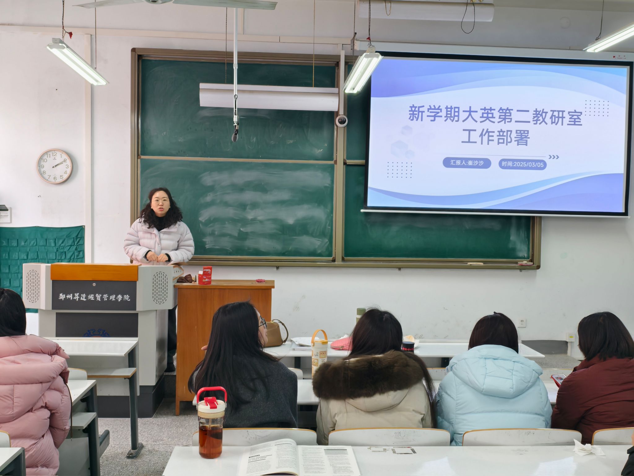 会议伊始,崔沙沙主任作开场发言。她首先对上学期教研室在教学科研、课程建设、学生竞赛指导等方面取得的成果进行了全面回顾与肯定,特别是对全体教师在过去一学期的辛勤付出表示感谢。随后,围绕“提质增效、内涵发展”的总体目标,崔主任从课程体系建设、课堂教学质量监控、教研活动创新、青年教师培养等方面,对本学期重点工作进行了系统部署和详细解读。她强调,新学期要继续以学生为中心,深化信息技术与英语教学的融合,探索多元化教学模式,切实提升学生的英语综合应用能力和跨文化交际素养。同时,她鼓励教师们积极参与各类教学比赛和教研项目,以研促教,教研相长。崔主任的讲话明确了新学期的工作方向与实施路径,为各项工作的有序开展奠定了坚实基础。