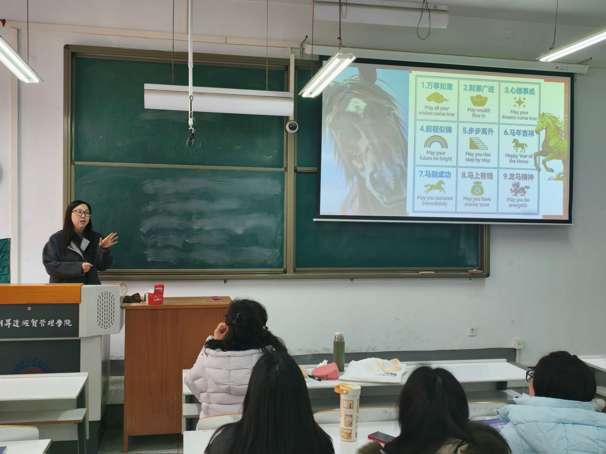 在随后的磨课展示环节,第一磨课小组的三位教师围绕《新视野大学英语综合教程》第四册第一单元的教学内容,依次进行了精彩纷呈的教学设计和思路分享,展现了各具特色的教学风格与深厚的专业素养。首先进行分享的是张慧丽老师。她的教学设计别出心裁,以“主题导入”和“思政元素挖掘”为切入点,巧妙结合了中国传统文化中的“马年”元素,通过生动形象的图片、视频和引人入胜的问题链,环环相扣,由浅入深地引导学生进入单元主题情境。张老师的设计不仅注重激发学生的学习兴趣和背景知识,更将价值引领自然地融入语言教学之中,旨在培养学生的文化自信和家国情怀,实现了知识传授与价值塑造的有机统一。