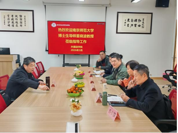 2026 年 3 月 12 日上午,南京师范大学博士生导师董晓波教授应邀莅临郑州升达经贸管理学院外国语学院,就高级别科研项目申报工作开展专题指导。外国语学院领导及骨干教师代表参加了本次指导座谈会。