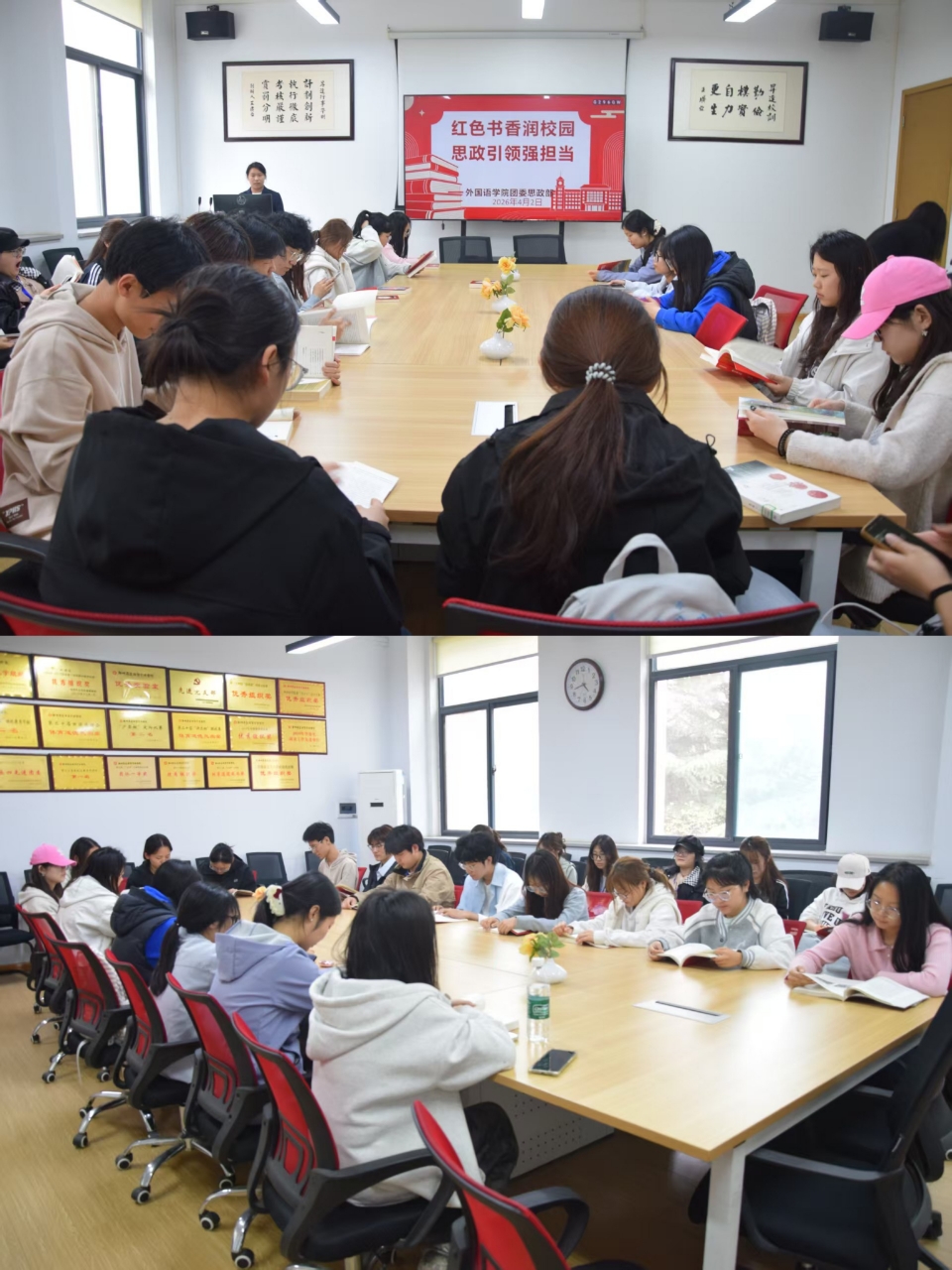 为深入推进思政教育建设、厚植学生家国情怀,由外国语学院团委学生会主办、思政部承办的“红色书香润校园 思政引领强担当” 主题读书会于4月2日在教一楼206顺利举办,学院团学各部门学生代表参与本次活动。