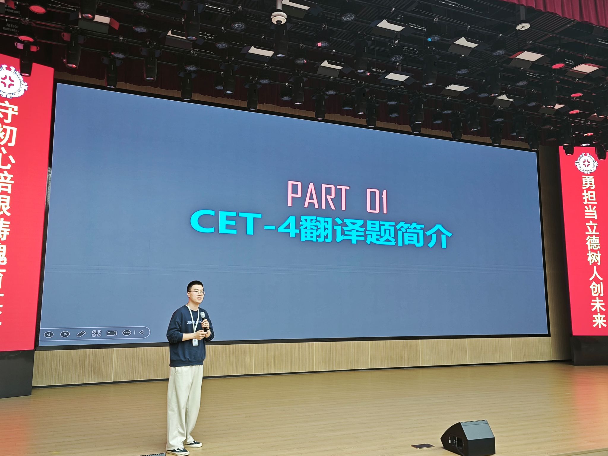 讲座中,张逸洋老师围绕四级翻译备考要点展开系统讲解,清晰梳理了四级翻译的考查形式与评分标准,深入剖析了汉英语言表达差异及考生常见失分点,并针对性提出“理解—拆分—翻译—检查”四步备考方法,为学子搭建了清晰的备考框架。随后,张老师结合“四合院”,“city walk” 等四级真题开展现场实战演练,带领师生逐句拆解、精准翻译,重点突破长难句处理、句式优化等备考难点,现场互动氛围浓厚,实操性极强。