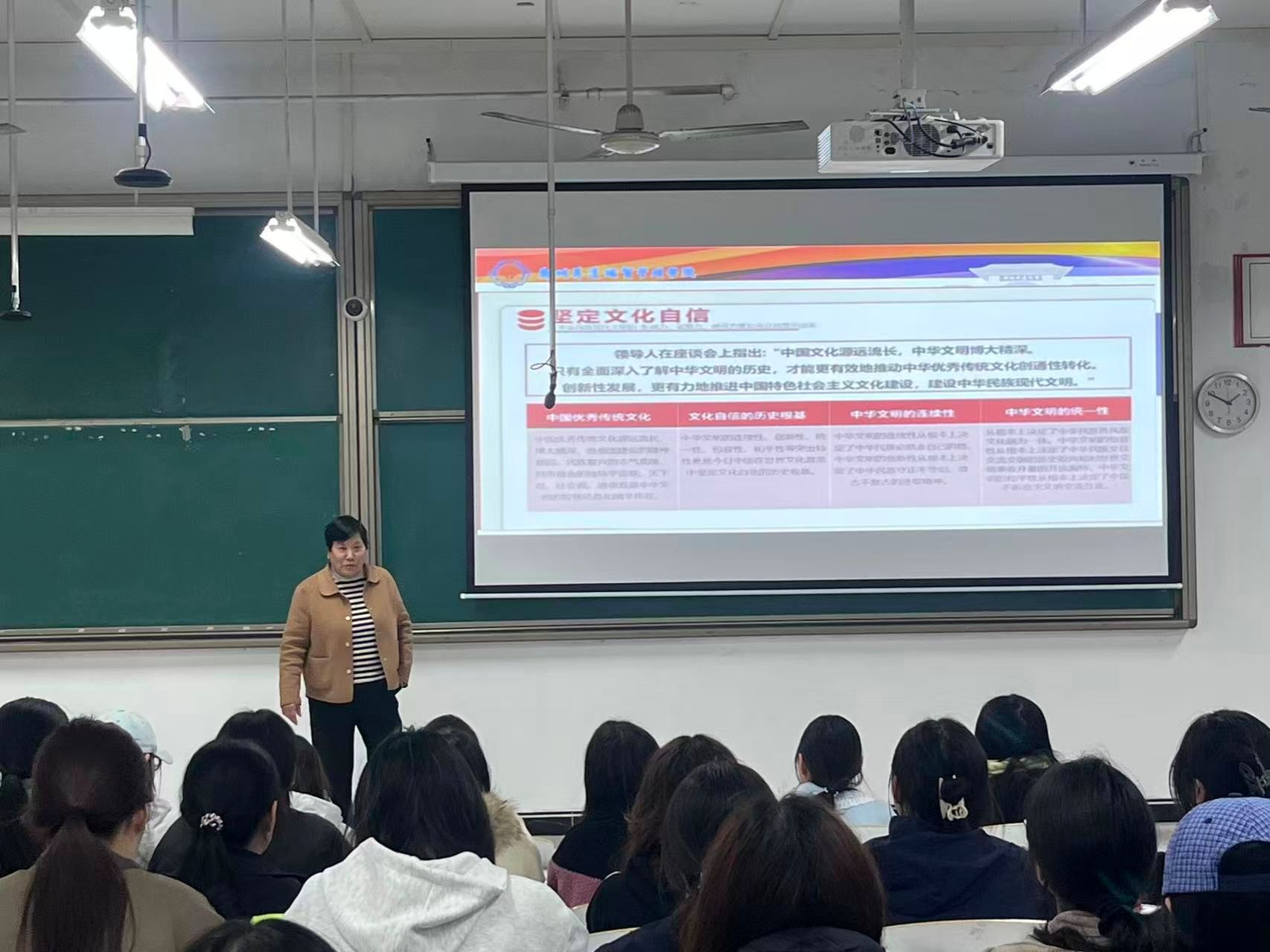 “学深悟透,筑牢思想根基”作为课程的开篇,王莉莉教授结合理论原著节选与权威解读视频,为同学们系统阐释了“四个自信”的核心内涵、历史渊源与时代价值。她提到,“四个自信”并非抽象的概念,而是植根于中华文明5000多年发展史、中国共产党百年奋斗史以及新时代十年伟大变革实践中的精神密码。在谈到文化自信时,她特别结合外语专业特色,以中外文化交流中的经典案例说明,坚定文化自信既要深耕中华优秀传统文化沃土,也要具备跨文化传播的开阔视野,同学们听后纷纷表示对“四个自信”的理论逻辑有了更清晰的认知。