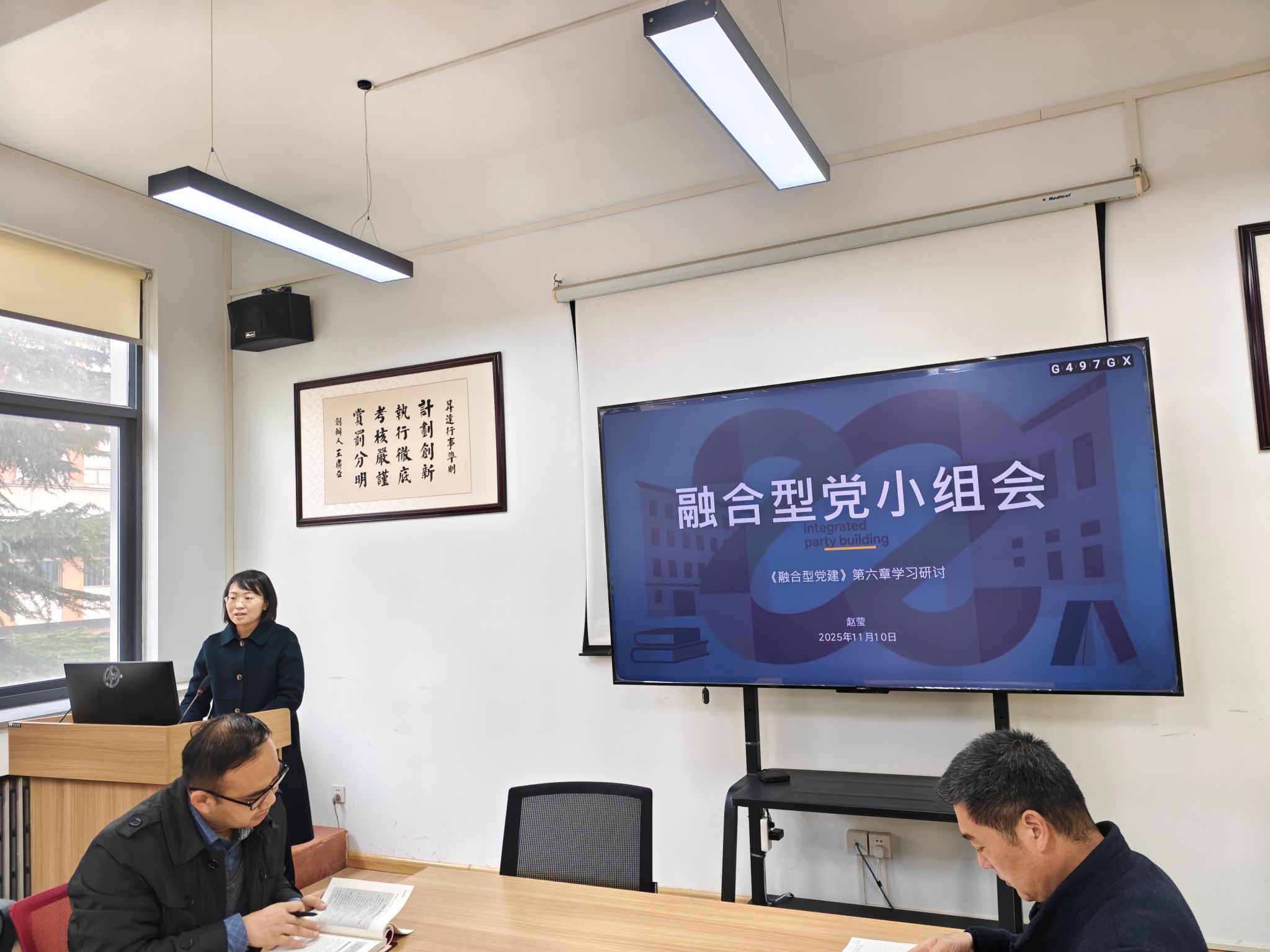 随后,大学英语第三教研室党支部书记赵莹同志领学《融合型党建》第六篇“融合型党小组会”。她重点阐述了党小组在基层治理中的“神经末梢”作用,提出通过构建“业务+党建”双融双促的党小组活动模式,提升组织活力和党员参与度。赵老师还展示了所在支部开展课程思政建设、青年教师帮扶等典型案例,引发与会人员共鸣。