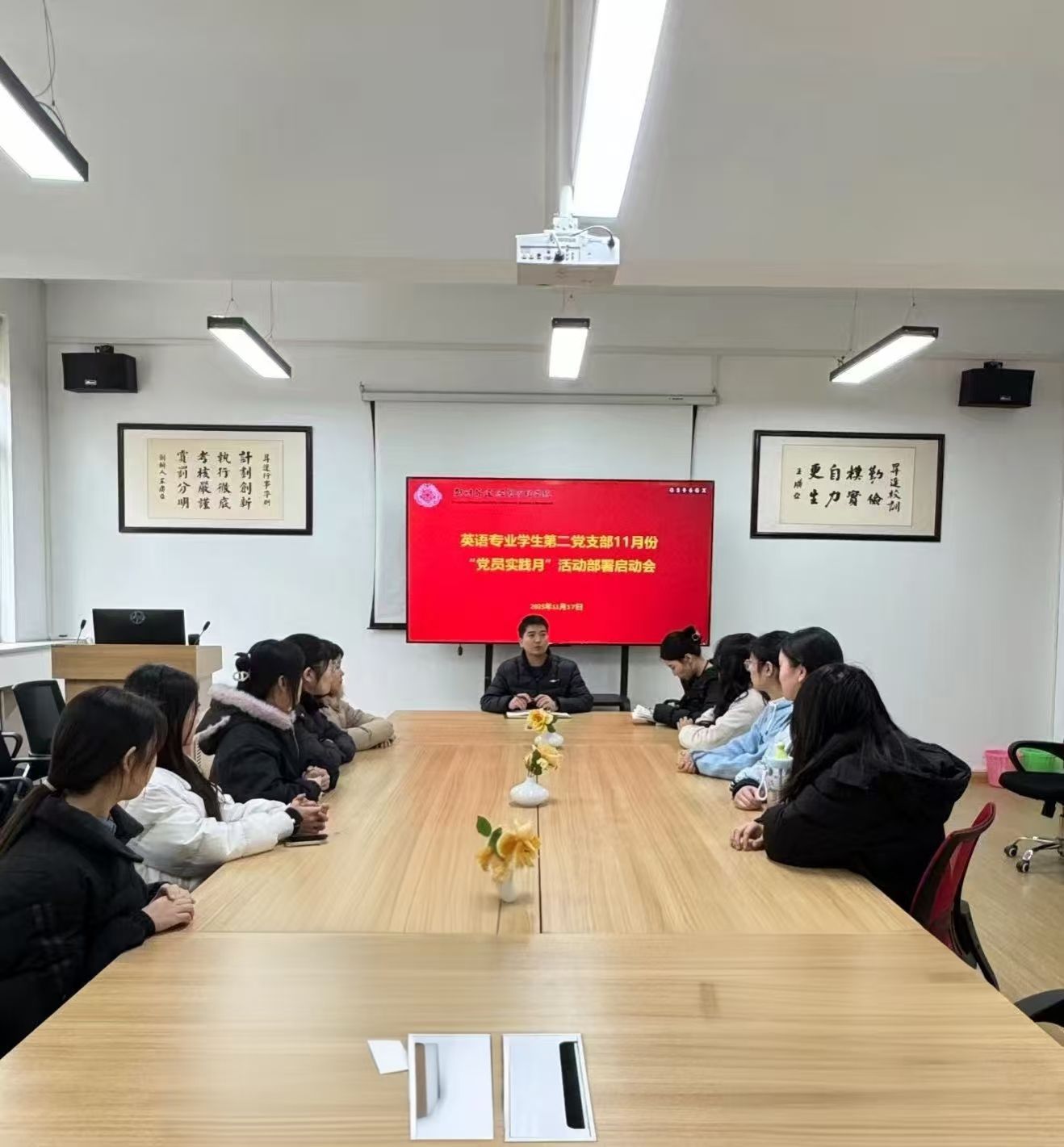 2025年11月17日,外国语学院英语专业学生第二党支部在教学1号楼206会议室召开2025年“党员实践月”启动动员会。会议由党支部书记赵老师主持,支部全体党员参加此次会议。