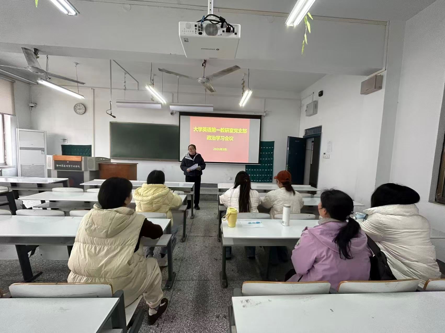 3月12日下午,为深入学习贯彻全国两会精神,切实把思想和行动统一到党中央决策部署上来,大学英语第一教研室党支部于综合楼330组织召开专题政治学习会议,全体党员参加会议,会议由党支部书记权宇同志主持。