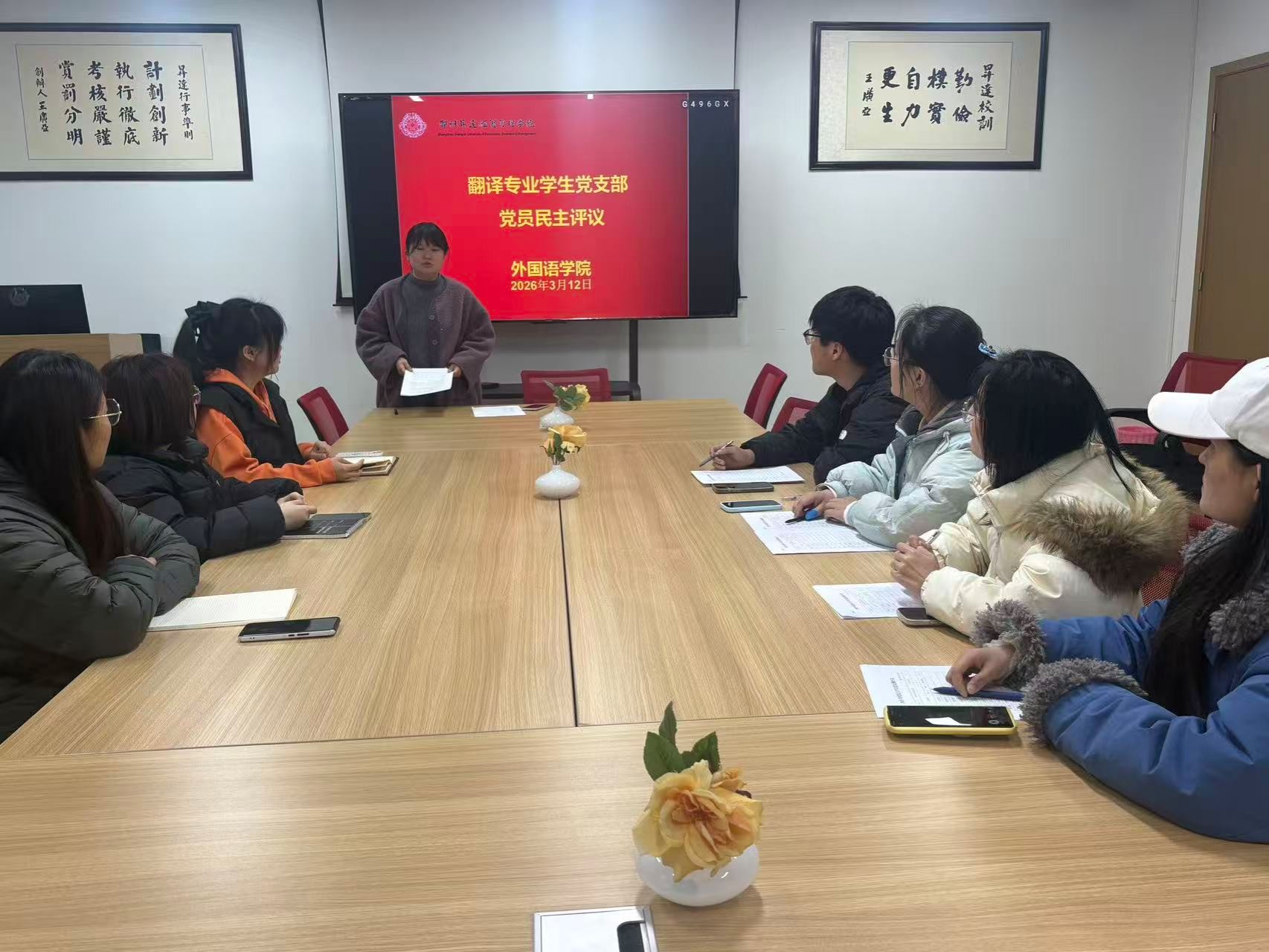 为严格落实上级党组织工作要求,严肃党内政治生活,3月17日,外国语学院翻译专业学生党支部在学院会议室召开2025年度组织生活会及民主评议党员会议。会议由党支部书记胡颖慧主持,全体党员参会,在外工作、实习的毕业生党员以线上形式参加会议。