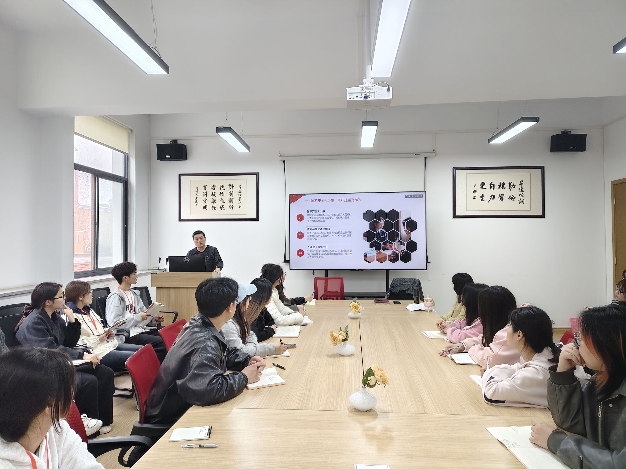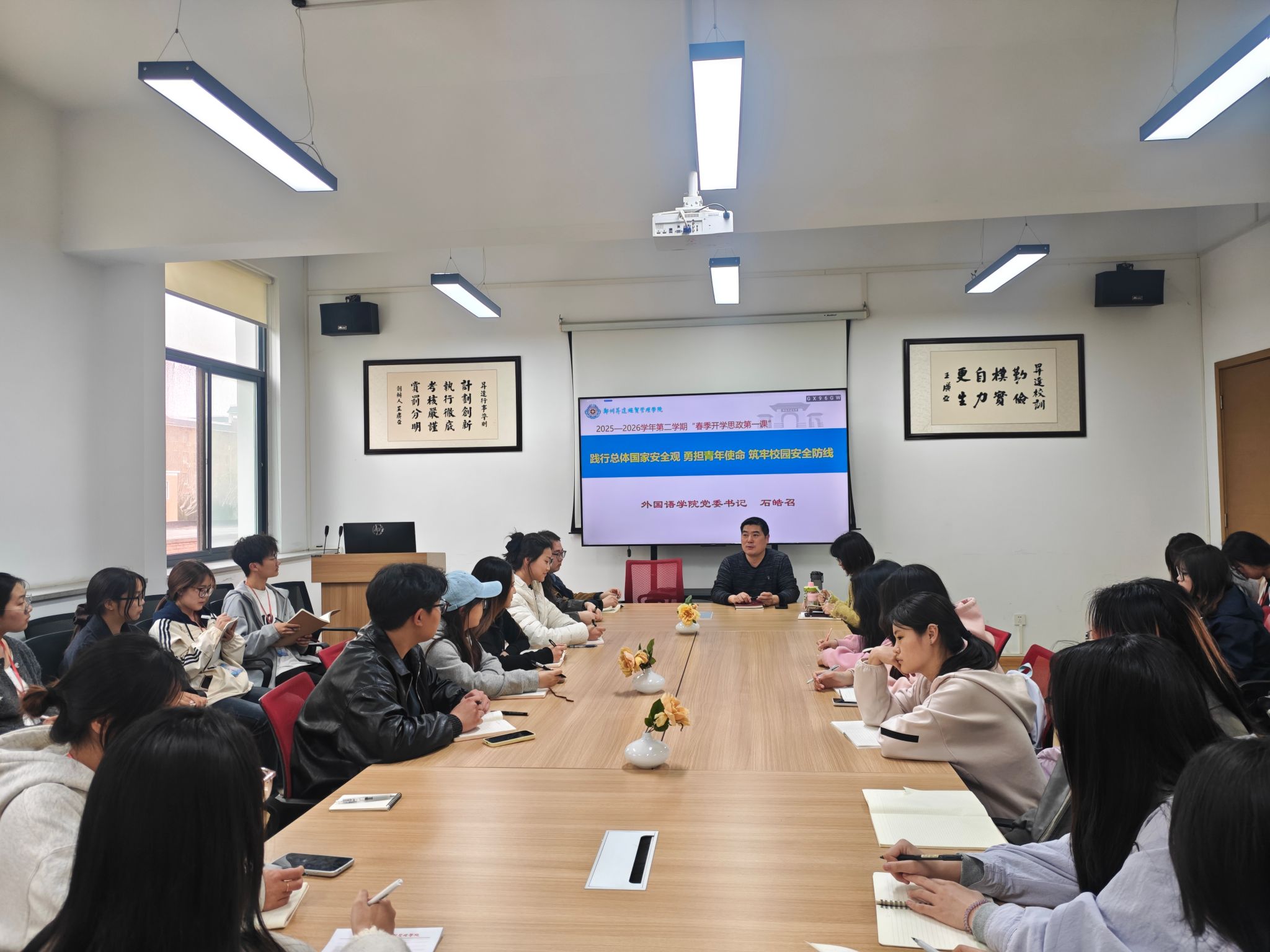 2026年3月26日,为深入学习贯彻总体国家安全观,强化青年学子安全意识与责任担当,外国语学院党委书记石皓召在教一楼206会议室,以“践行总体国家安全观 勇担青年使命 筑牢校园安全防线”为主题,为学院全体团学干部讲授2026年春季开学“思政第一课”。学院党委副书记丁玥及全体团学骨干参会。