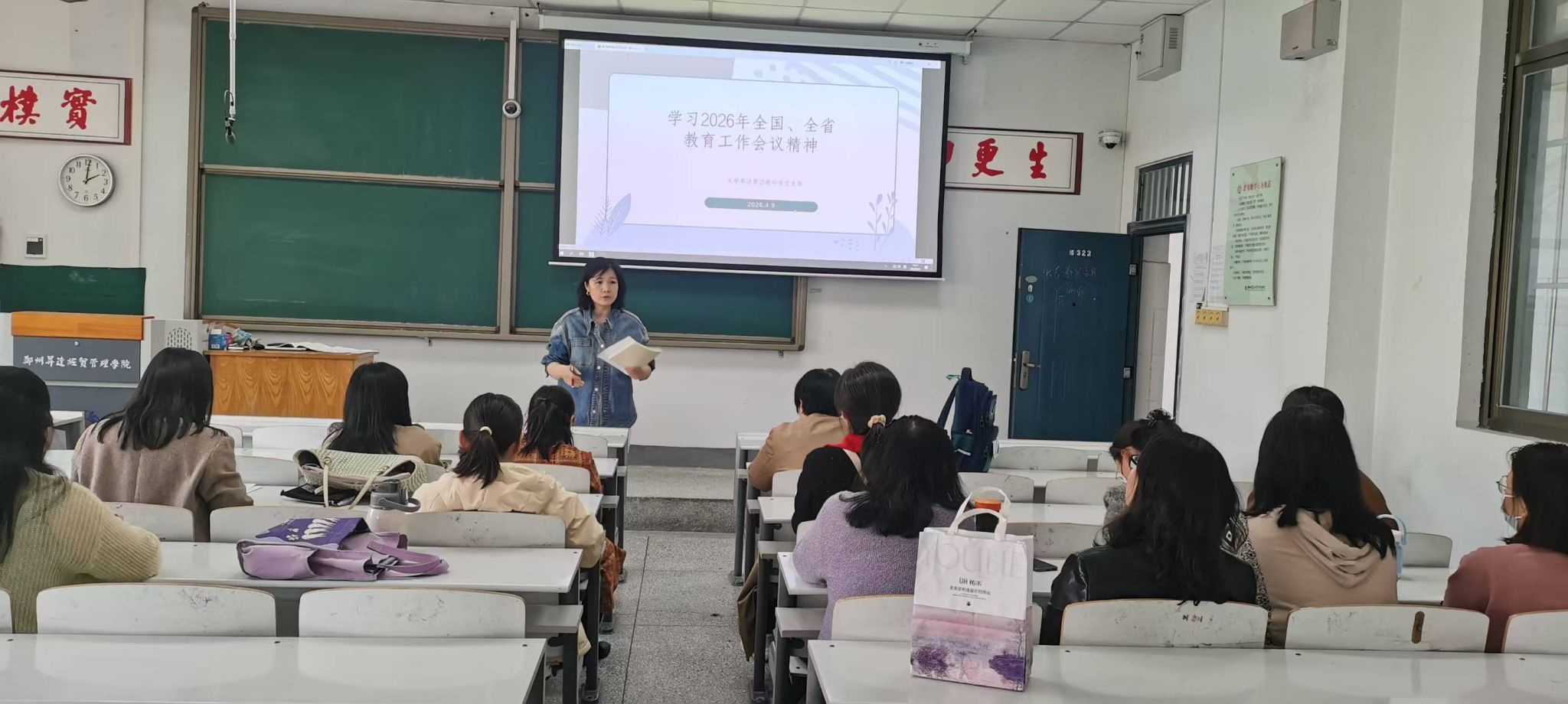 2026年4月9日下午,外国语学院大学英语第四教研室党支部在综合楼322教室召开专题会议,认真学习《习近平给四所交通大学全体师生的回信》以及2026年全国、全省教育工作会议精神,紧扣立德树人根本任务,结合工作实际研讨落实举措。党支部书记王晓静同志主持会议,全体教师参加会议。